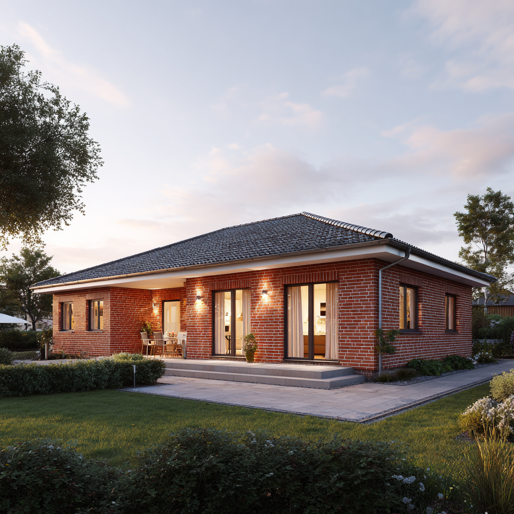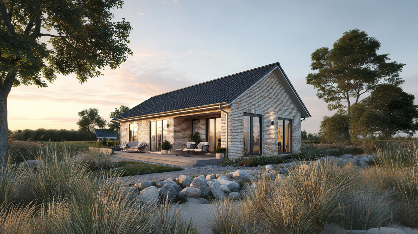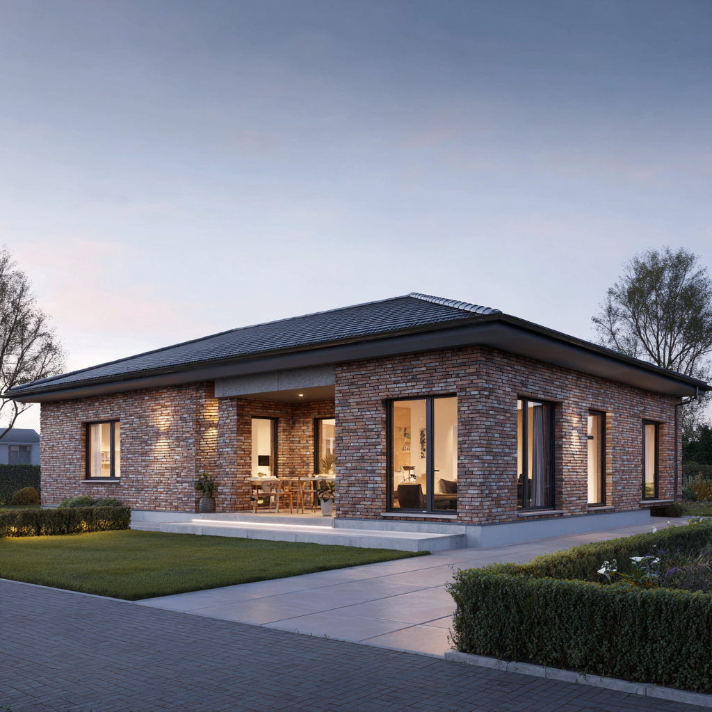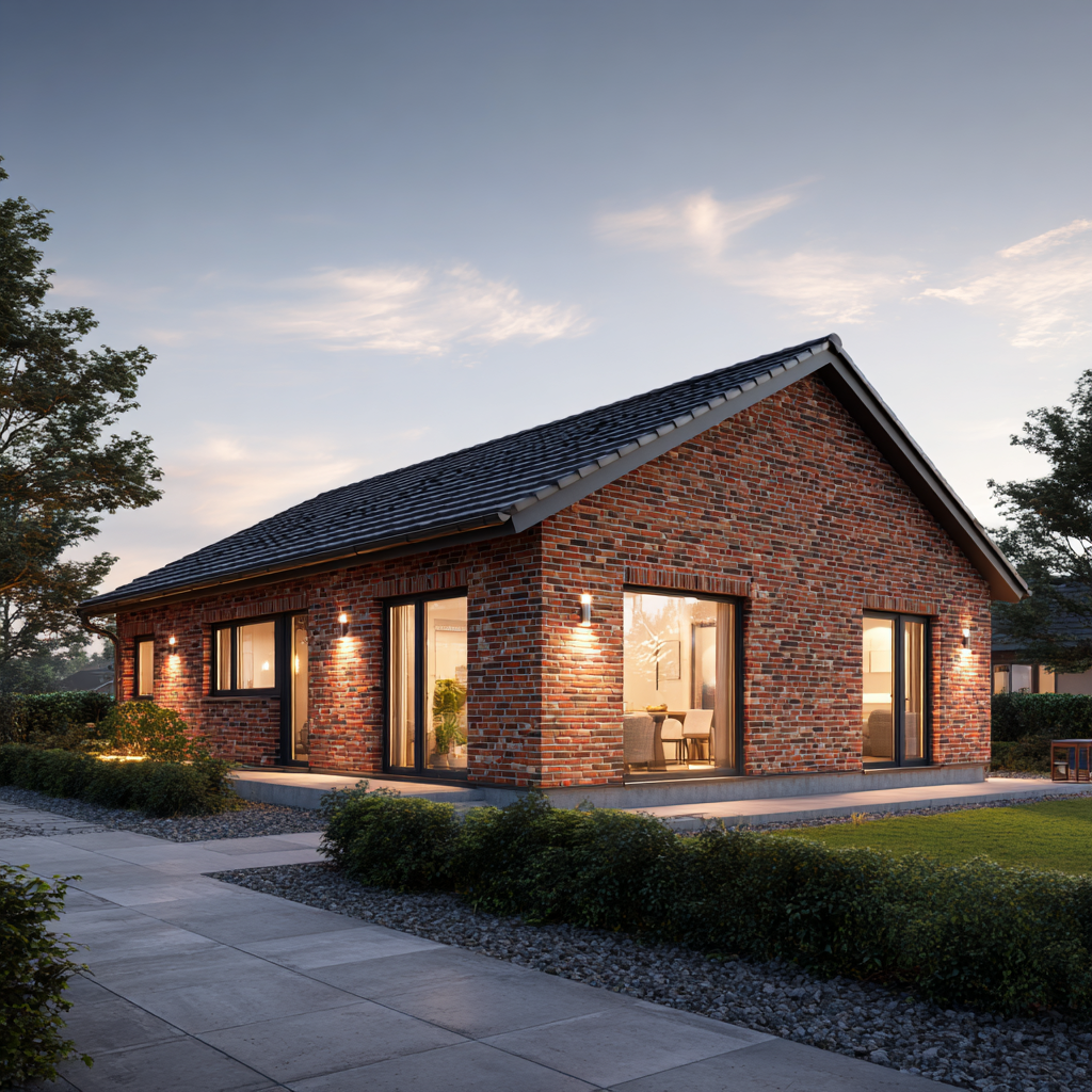 Nordisch, klar, geborgen – der Bungalow „Deichrose 102“ verbindet klassische Satteldach-Architektur mit hellrotem Klinker und ausgewogenen Proportionen. Auf einer Ebene entsteht ein gemütliches, wertbeständiges Massivhaus, das abends warmes Licht in den Garten trägt. Massiv gebaut, energieeffizient, mit Festpreis- und Bauzeitgarantie. Ein Küstenhaus, das Ruhe ausstrahlt und lange Freude macht.