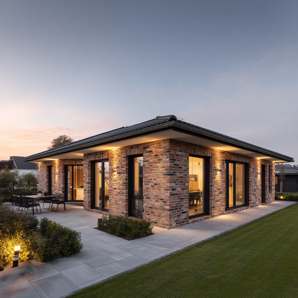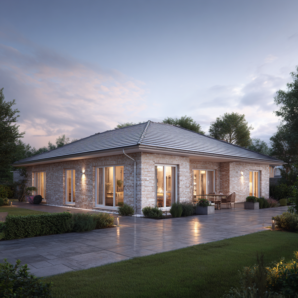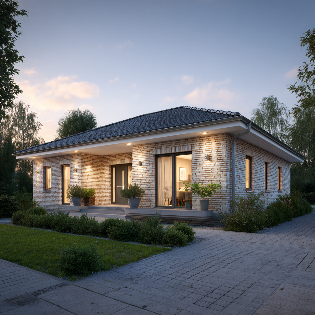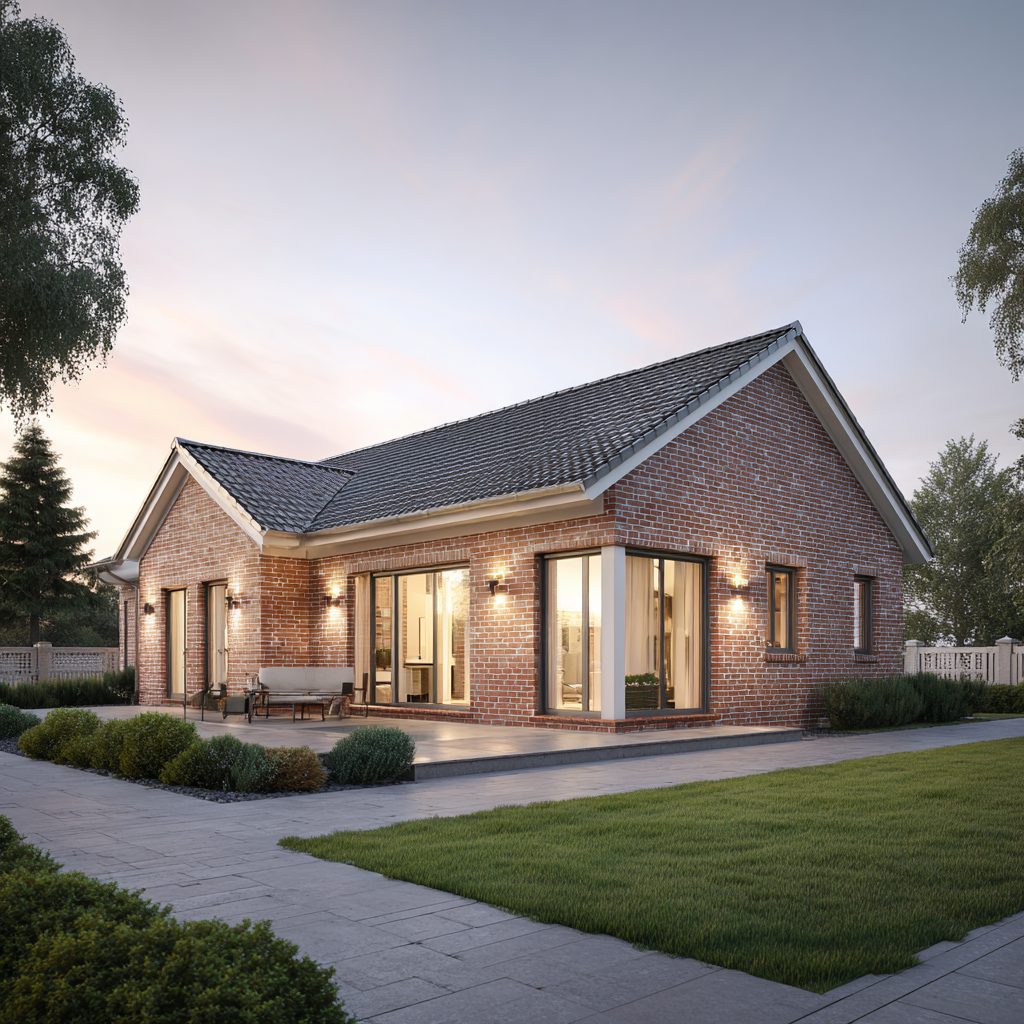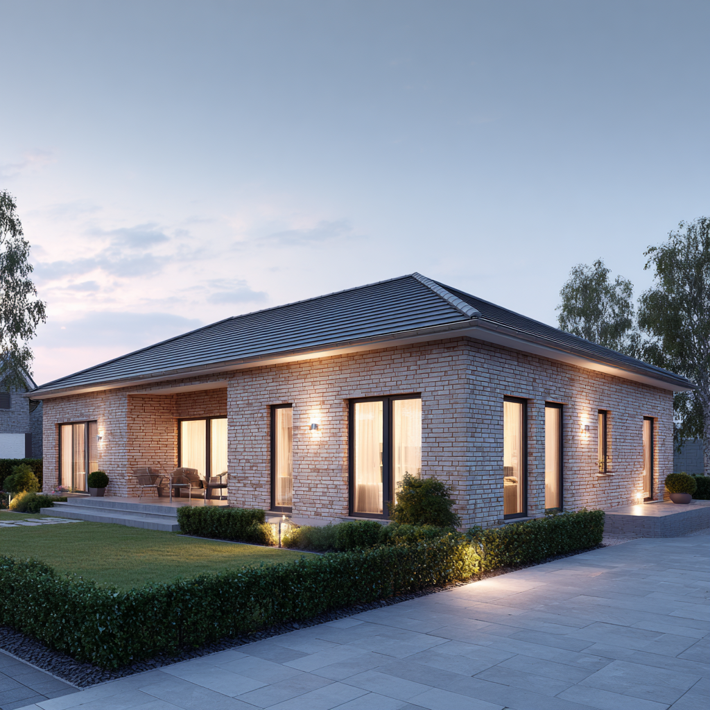 Nordisch, klar, geborgen – der Bungalow „Deichrose 102“ verbindet klassische Satteldach-Architektur mit hellrotem Klinker und ausgewogenen Proportionen. Auf einer Ebene entsteht ein gemütliches, wertbeständiges Massivhaus, das abends warmes Licht in den Garten trägt. Massiv gebaut, energieeffizient, mit Festpreis- und Bauzeitgarantie. Ein Küstenhaus, das Ruhe ausstrahlt und lange Freude macht.