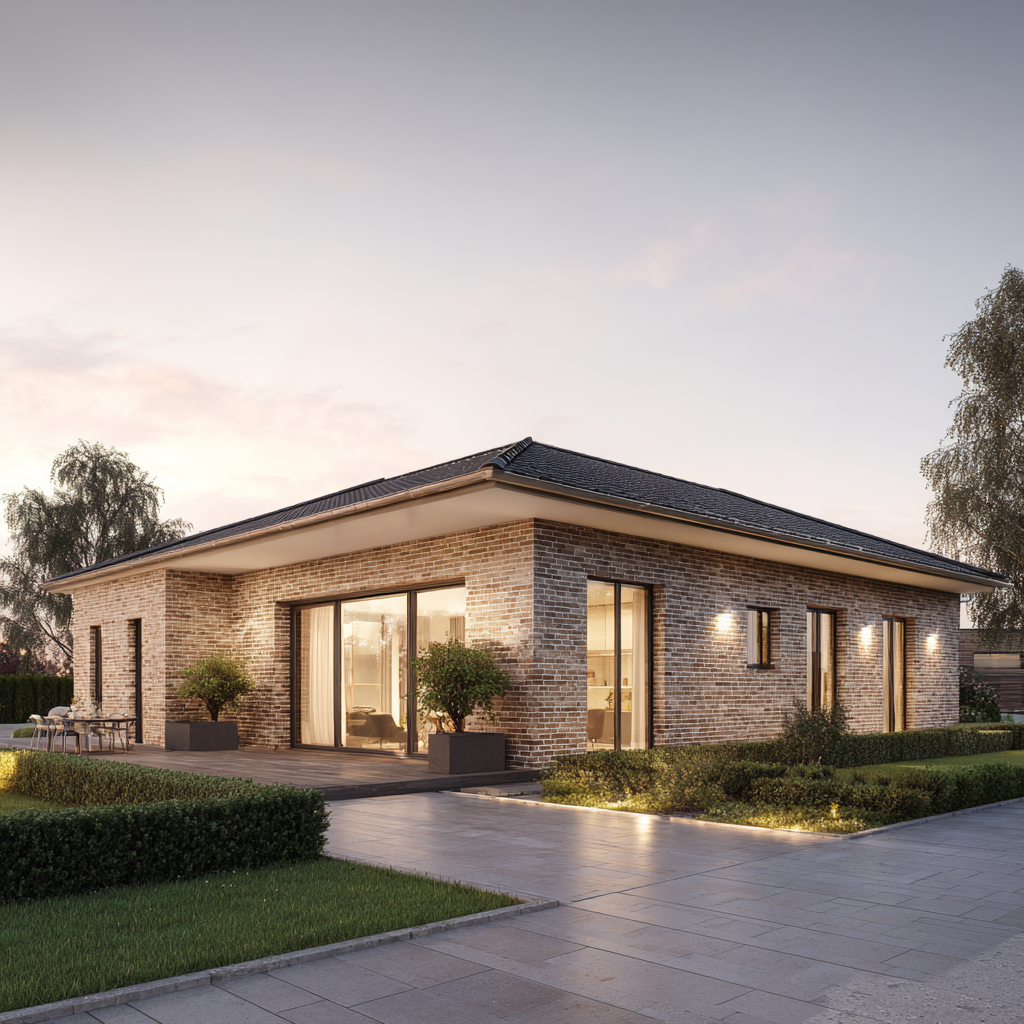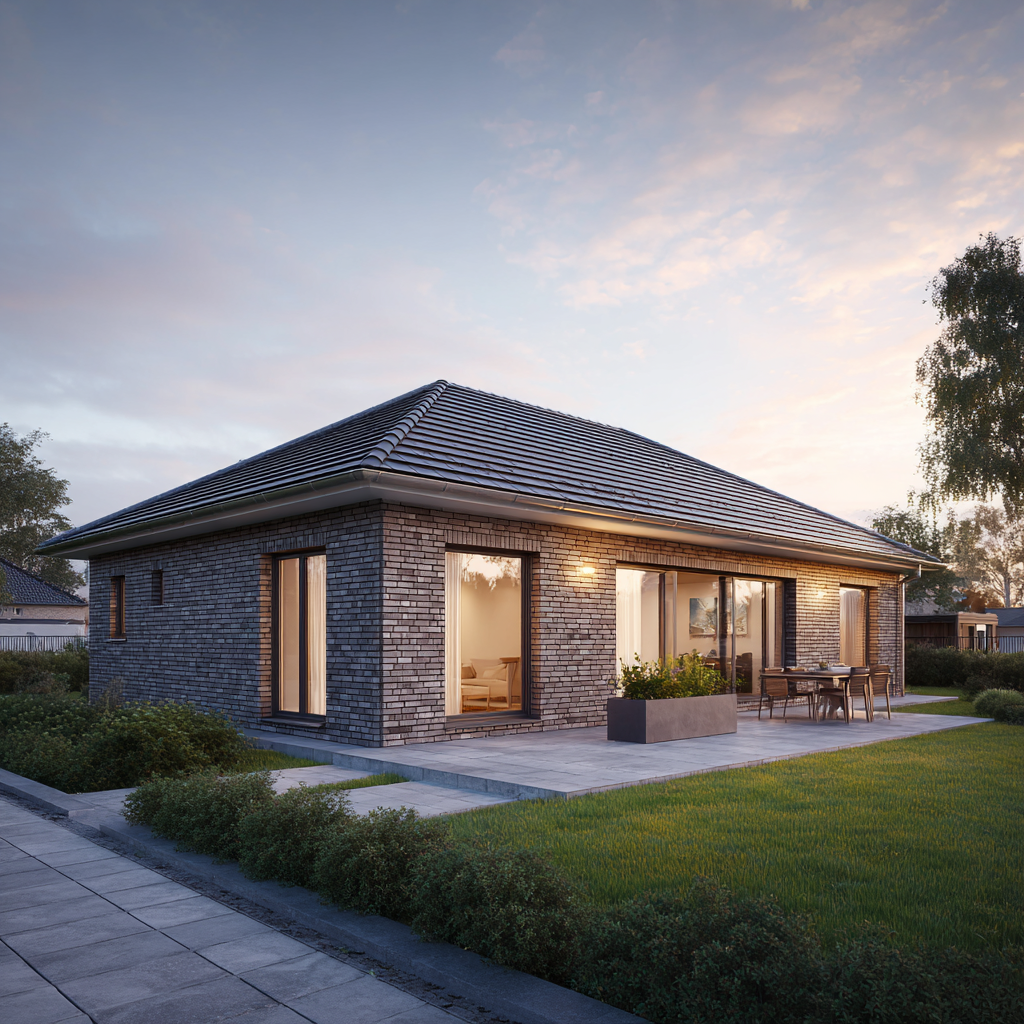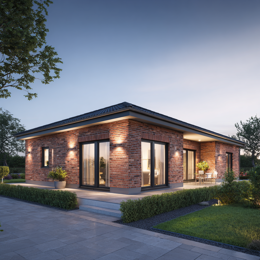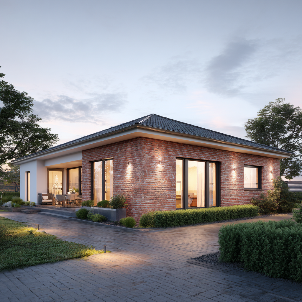 Klar, kompakt und verlässlich, der Bungalow „Küstenhain 104“ steht für bodenständige Architektur und norddeutsche Beständigkeit. Der rotbraune Klinker, das klassische Satteldach und die klare Raumaufteilung schaffen ein Zuhause mit Charakter. Massiv gebaut, energieeffizient und mit Festpreis- sowie Bauzeitgarantie, ein Haus, das Ruhe und Sicherheit ausstrahlt.
