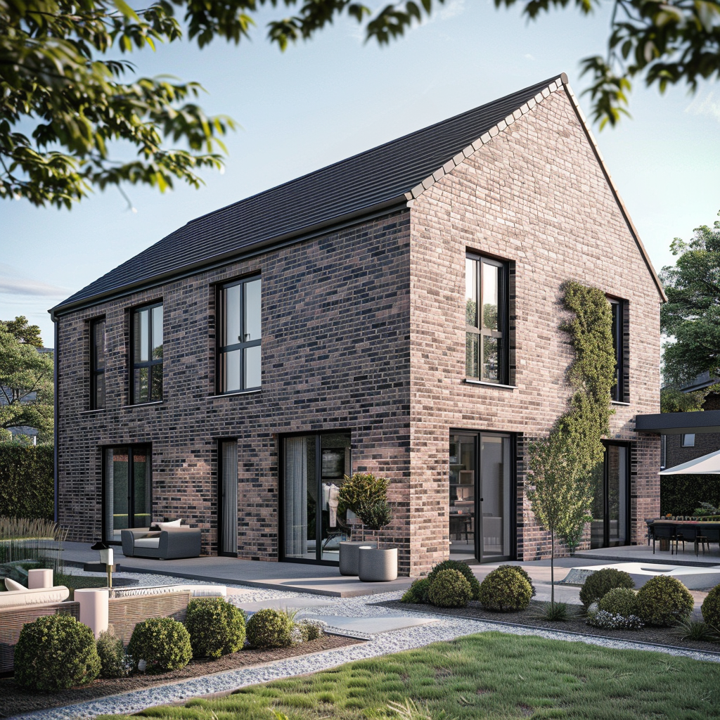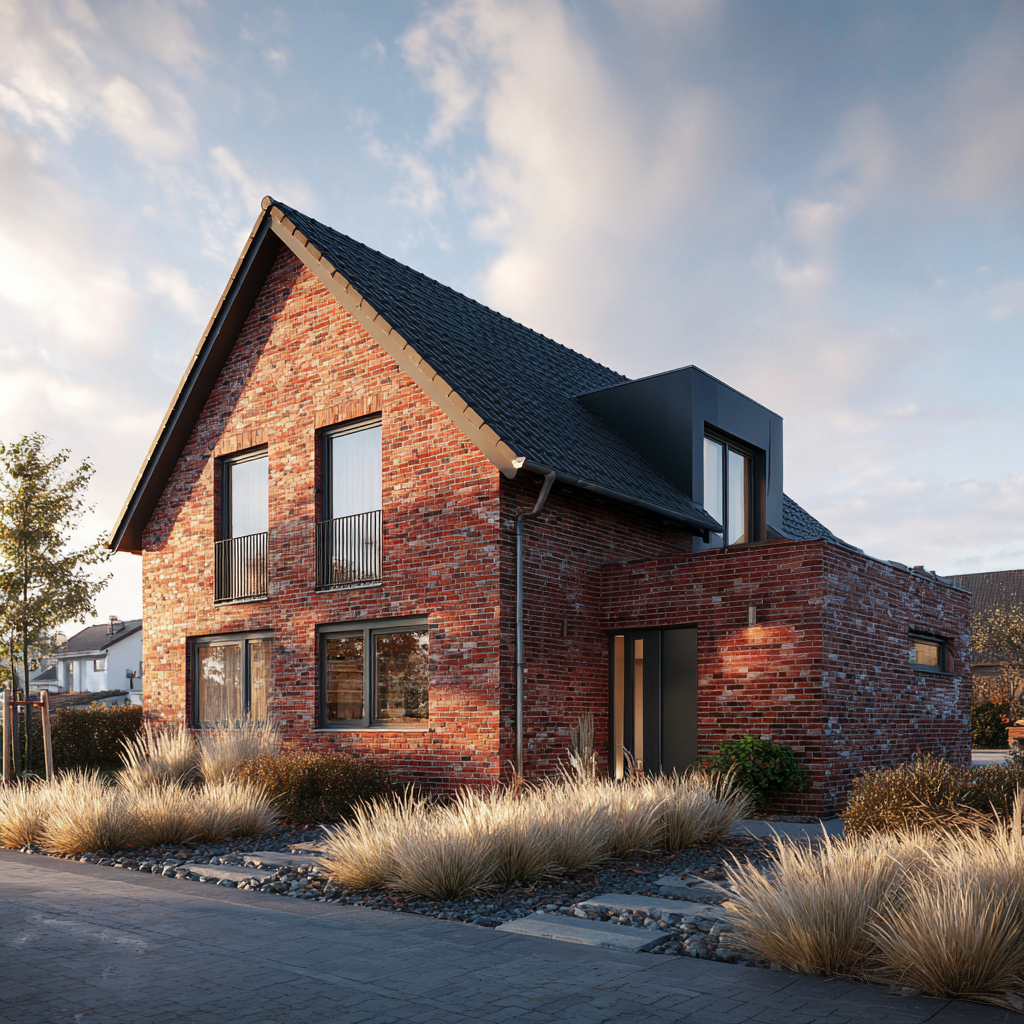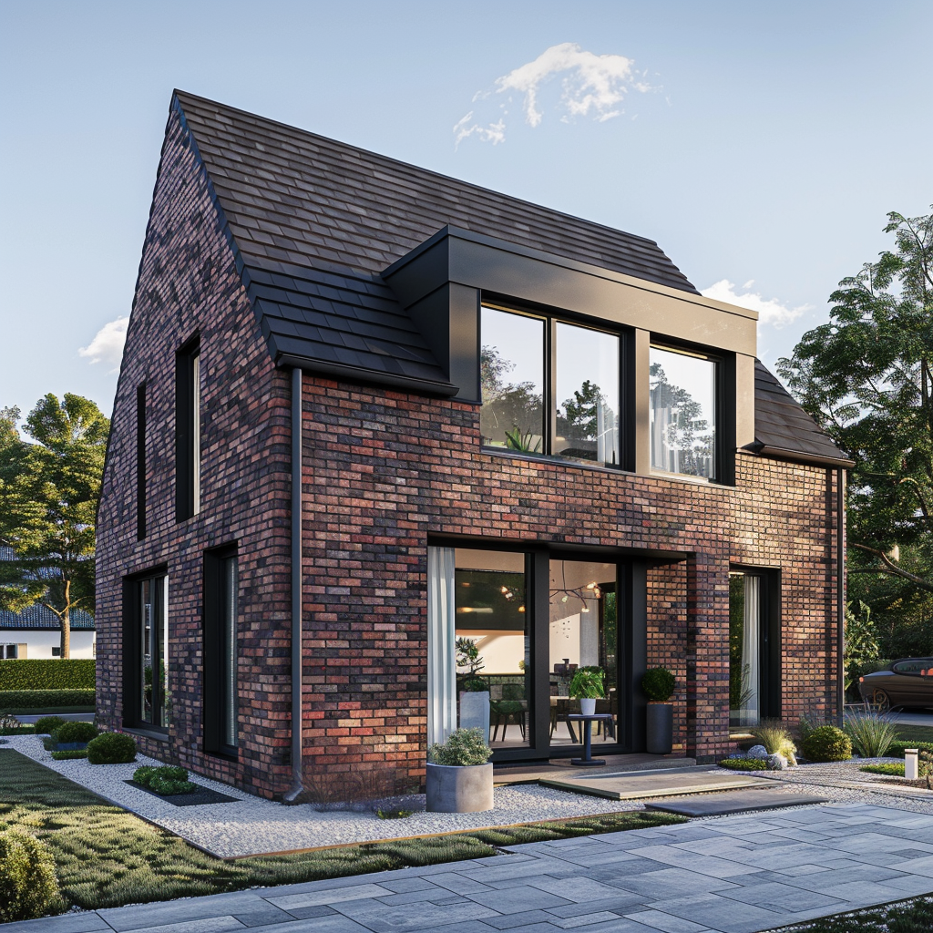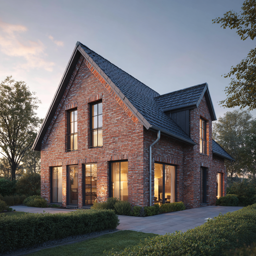Der Klinkerhof 180 ist ein großzügiges, hochwertiges Klinkerhaus mit ruhiger Architektur und klaren Linien. Rotbrauner Klinker, schwarzes Walmdach und ein reduzierter Garten verleihen ihm eine repräsentative, zeitlose Ausstrahlung.