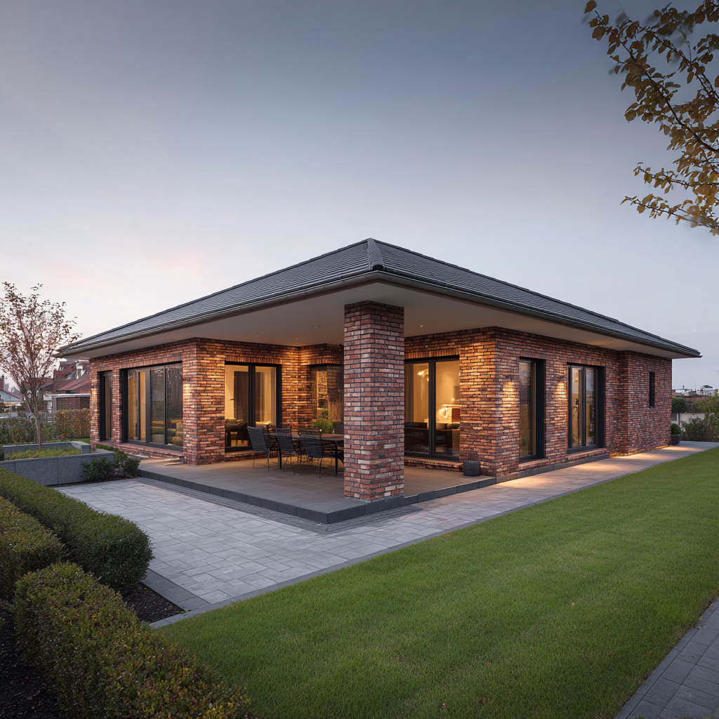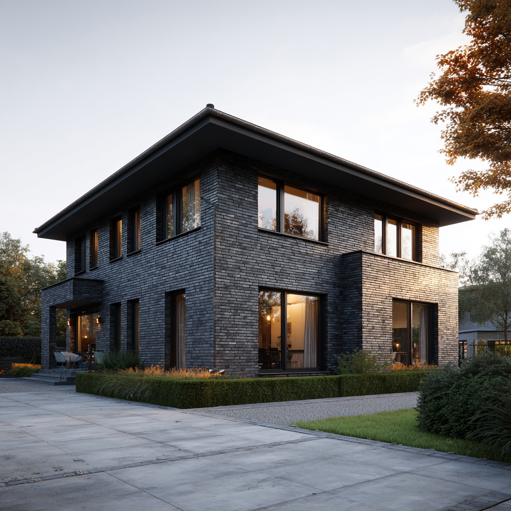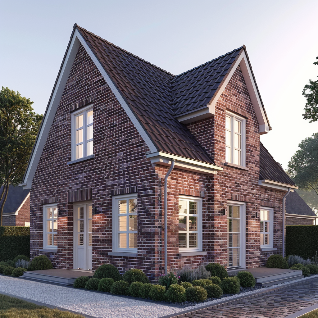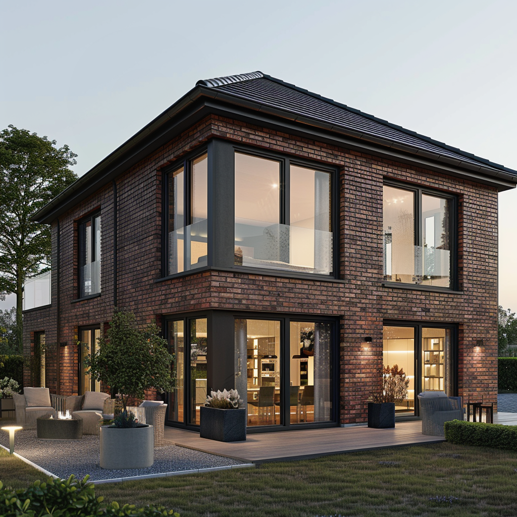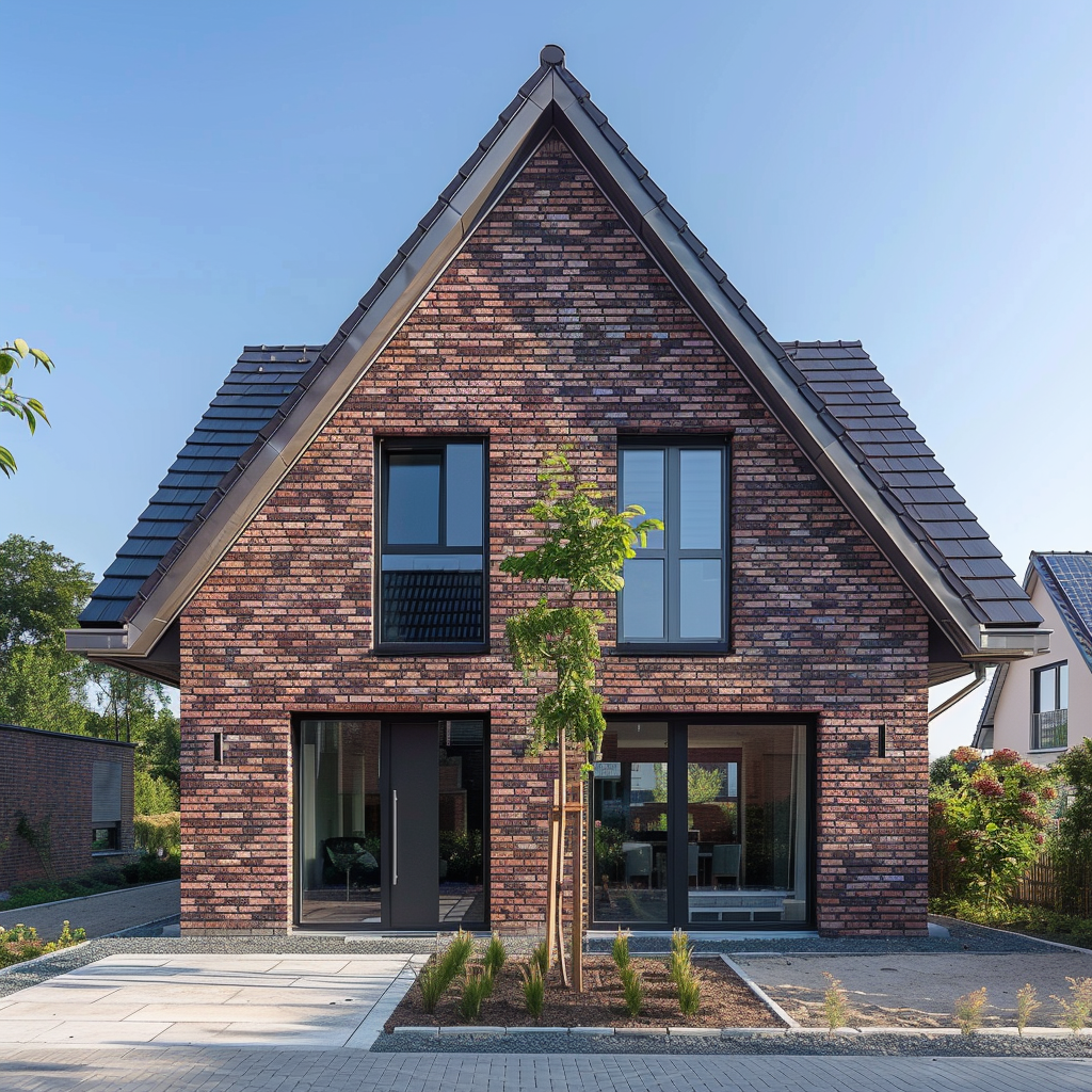 Der Klinkerhof 180 ist ein großzügiges, hochwertiges Klinkerhaus mit ruhiger Architektur und klaren Linien. Rotbrauner Klinker, schwarzes Walmdach und ein reduzierter Garten verleihen ihm eine repräsentative, zeitlose Ausstrahlung.