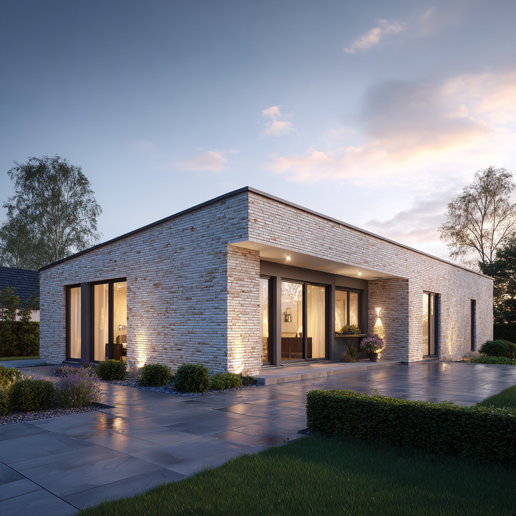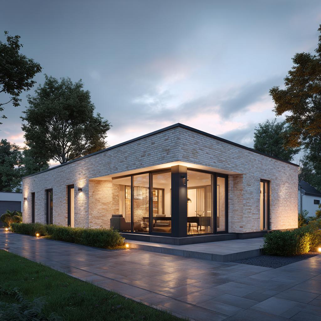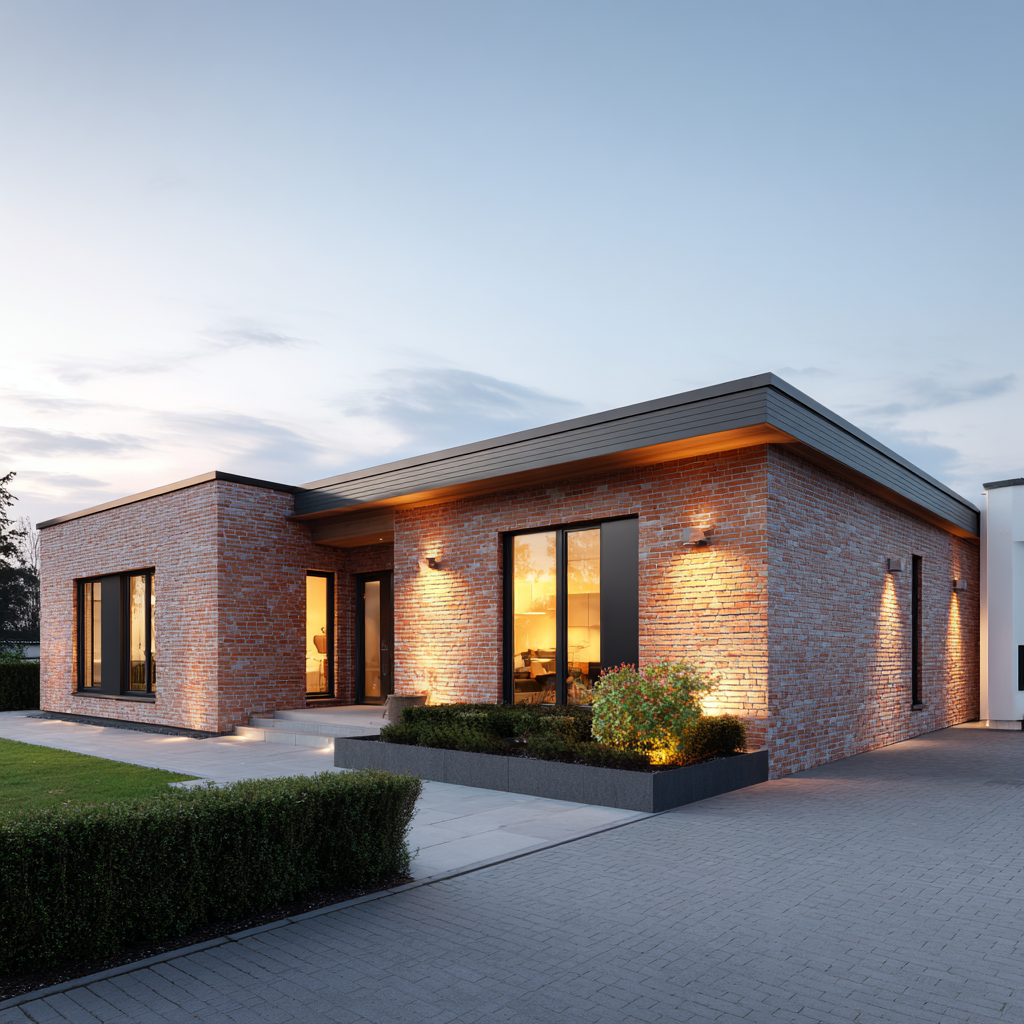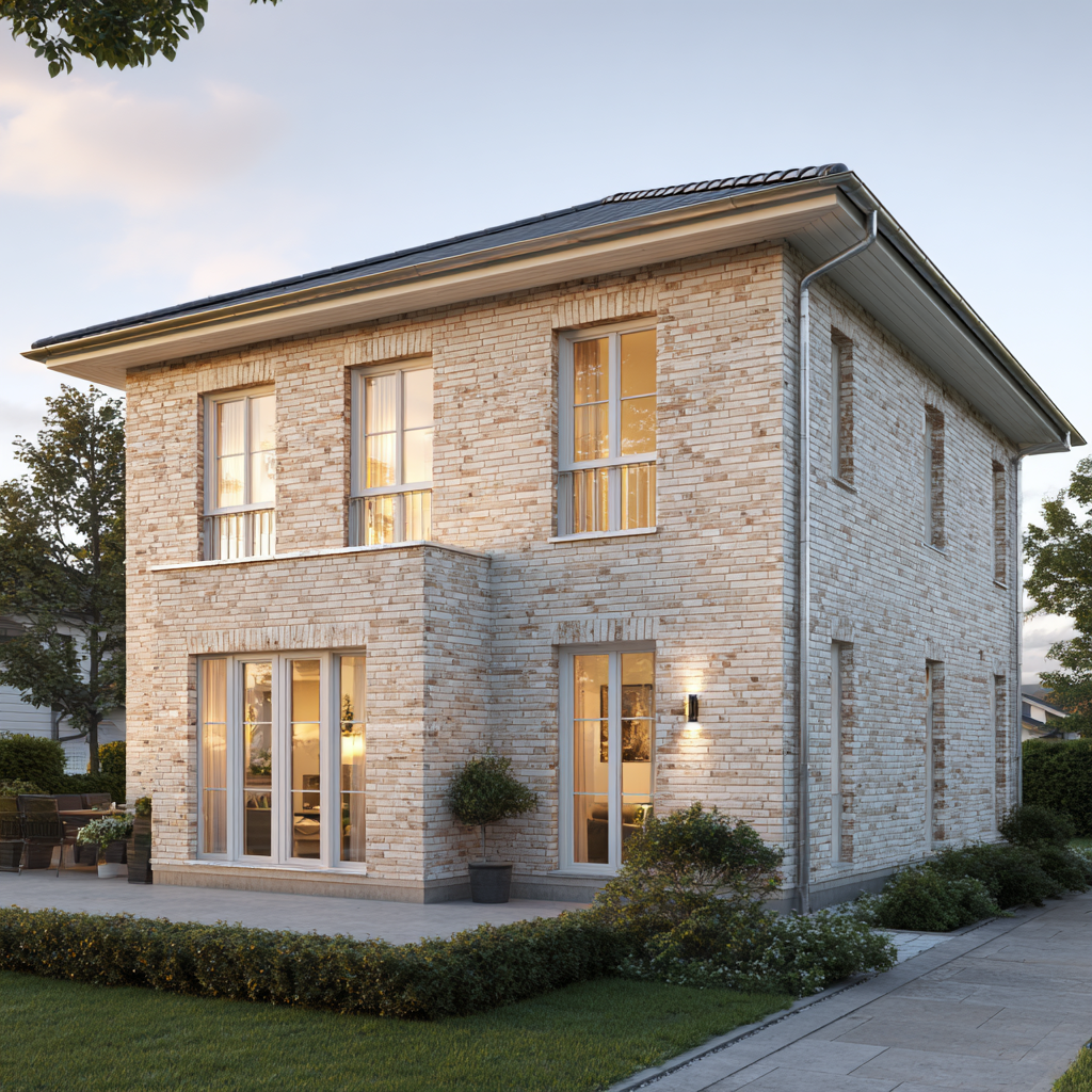 Der Backstein Modern 150 ist ein elegantes, modern interpretiertes Klinkerhaus mit sandbeiger Fassade und klarer Formensprache. Großformatige Fenster und ein reduzierter Garten verleihen ihm eine ruhige, hochwertige Ausstrahlung – zeitlos, norddeutsch und angenehm zurückhaltend.