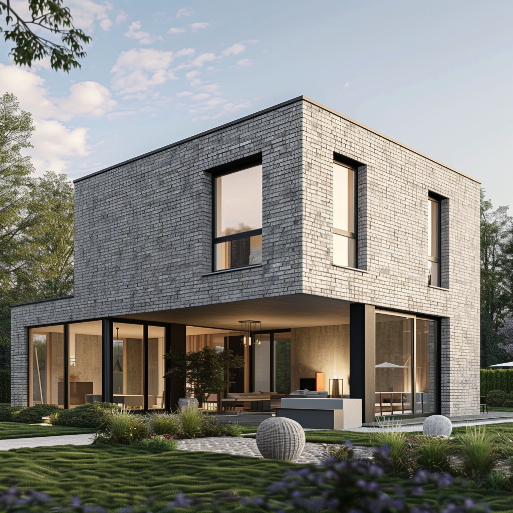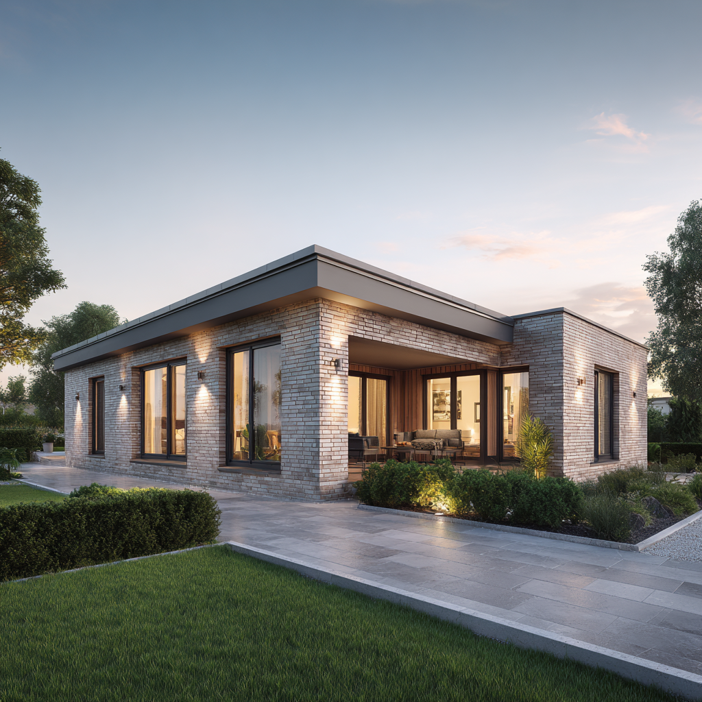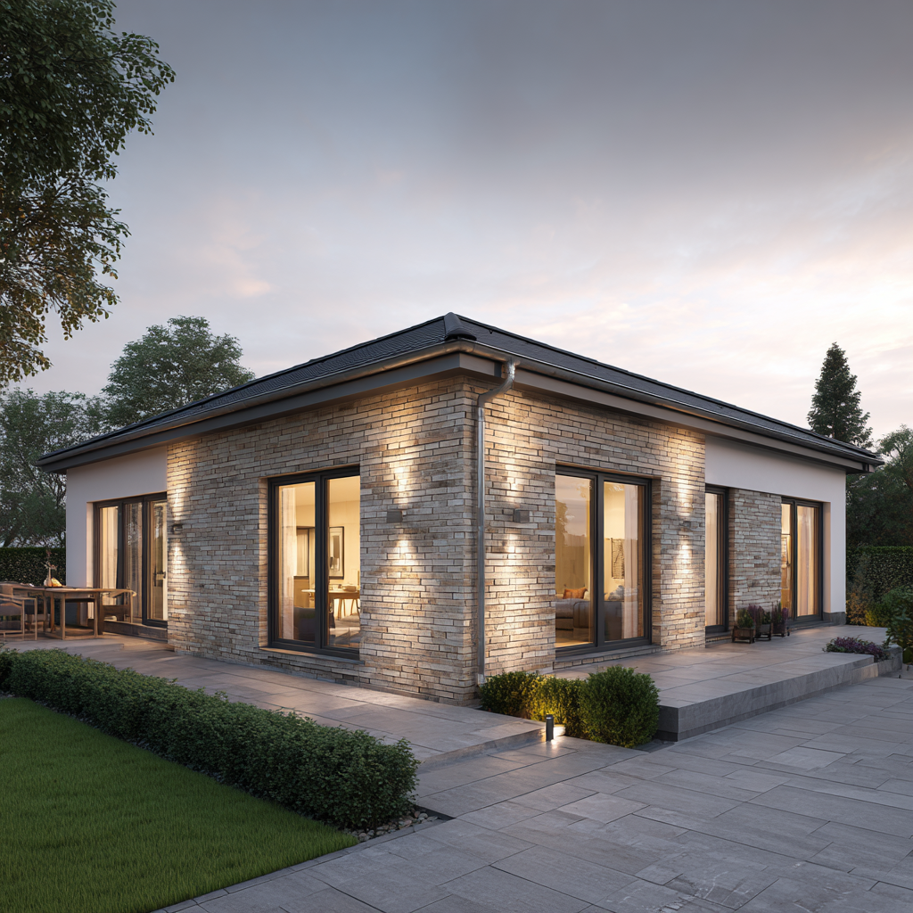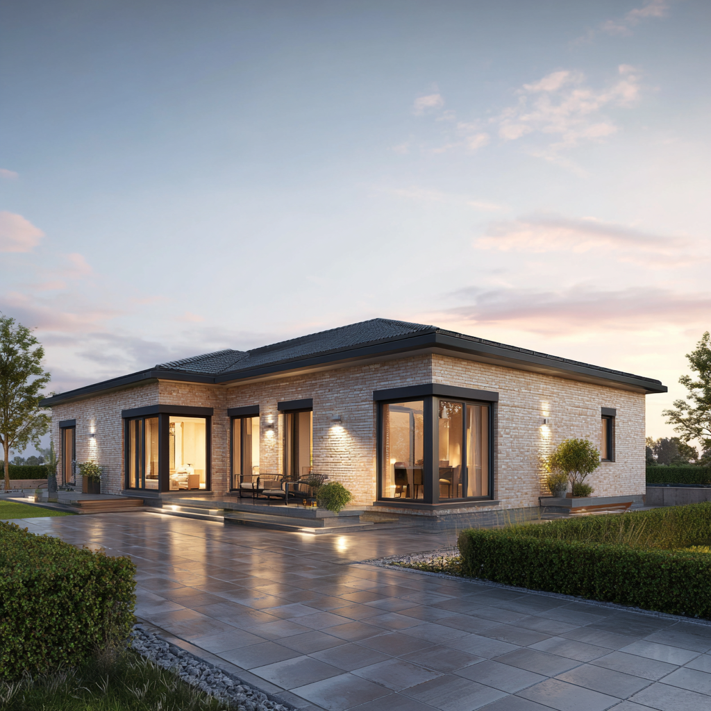 Der Backstein Modern 150 ist ein elegantes, modern interpretiertes Klinkerhaus mit sandbeiger Fassade und klarer Formensprache. Großformatige Fenster und ein reduzierter Garten verleihen ihm eine ruhige, hochwertige Ausstrahlung – zeitlos, norddeutsch und angenehm zurückhaltend.