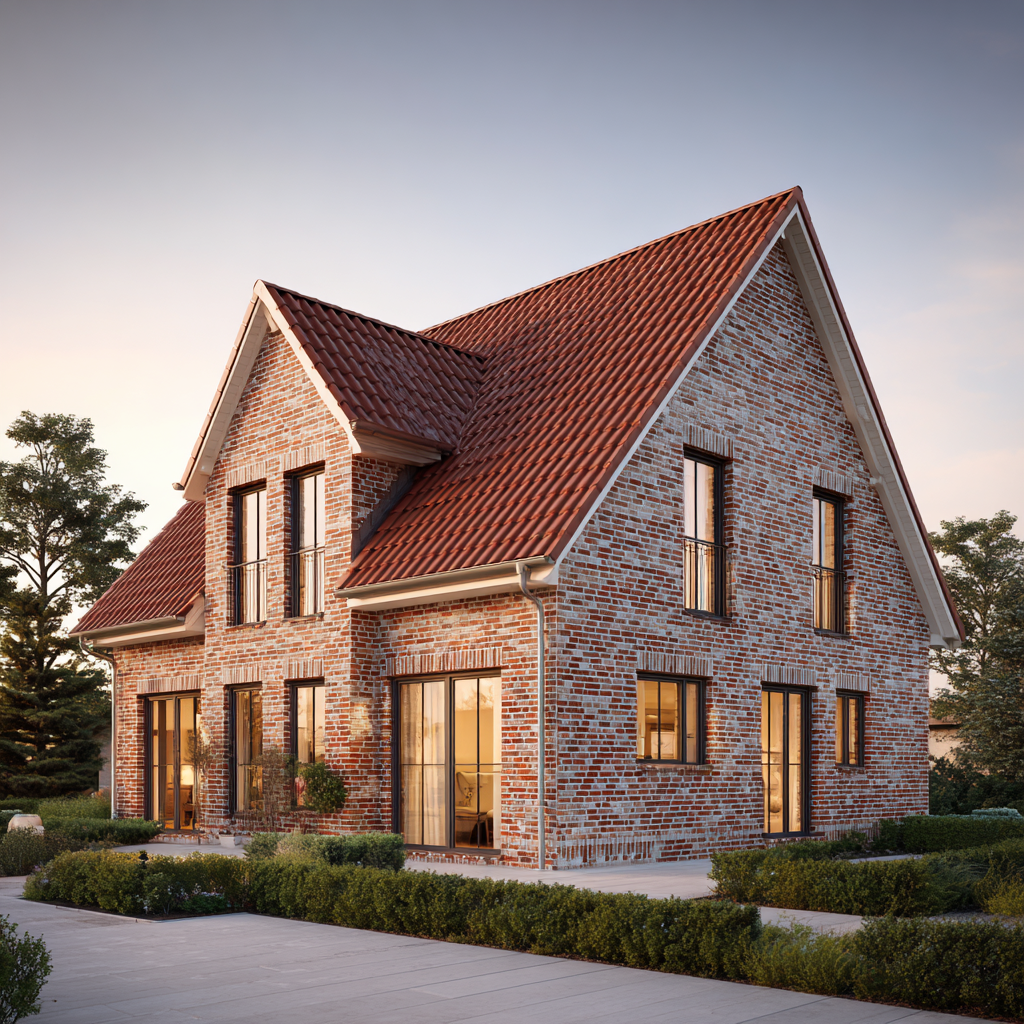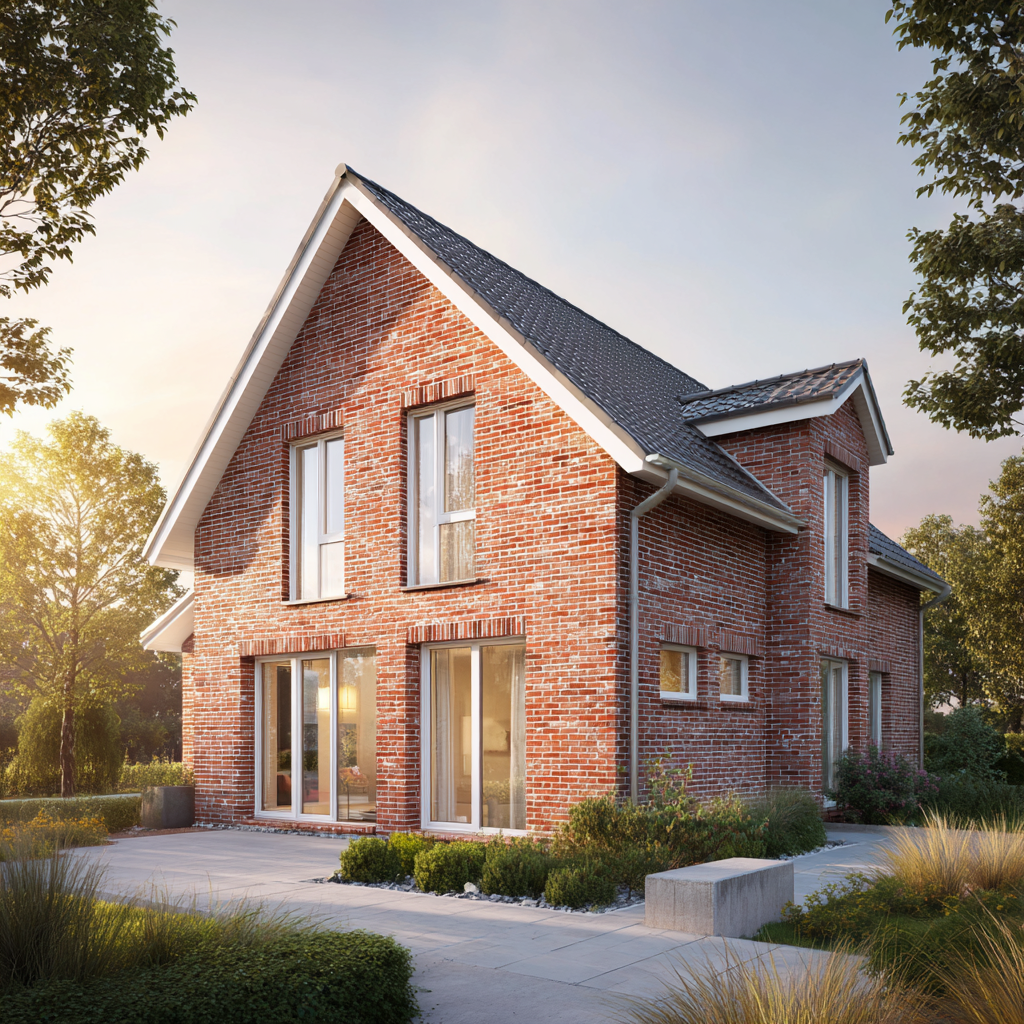 Der Küstenklinker 128 ist ein kompakter Küstenklassiker aus rotem Klinker, klar gegliedert und freundlich im Ausdruck. Mit seinem harmonischen Satteldach, den hellen Fensterflächen und dem typischen norddeutschen Charme bietet er ein Zuhause, das gleichzeitig modern, solide und angenehm bodenständig wirkt.