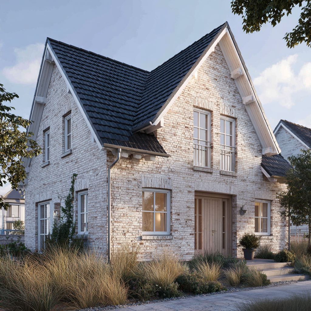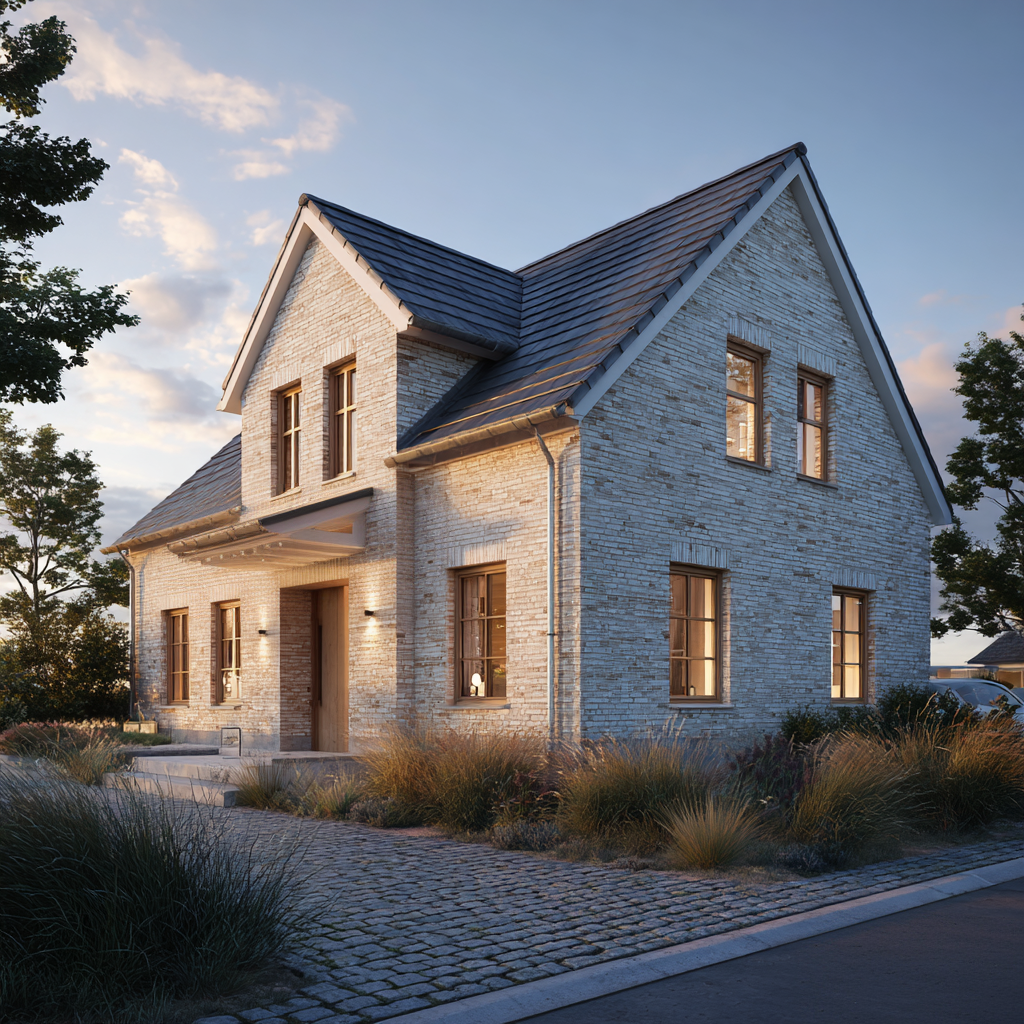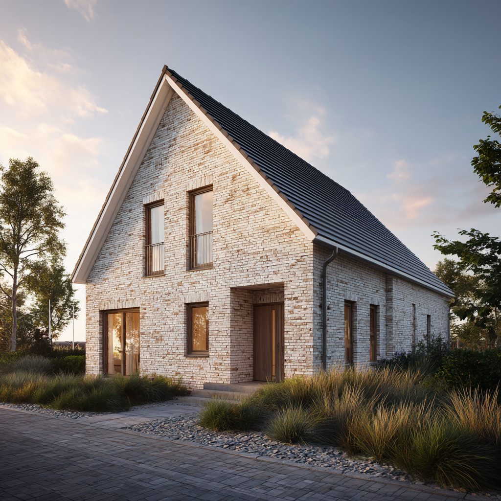 Sandhafen 142 verbindet die klassische norddeutsche Baukultur mit der klaren, zeitlosen Linienführung moderner Architektur. Der warm sandfarbene Dünensand-Klinker verleiht dem Haus eine natürliche, weiche Ausstrahlung, die perfekt zu den Küstenlandschaften Norddeutschlands passt. Die matte Oberfläche wirkt dabei besonders authentisch und lässt die Fassade im Golden-Hour-Licht harmonisch aufleuchten.