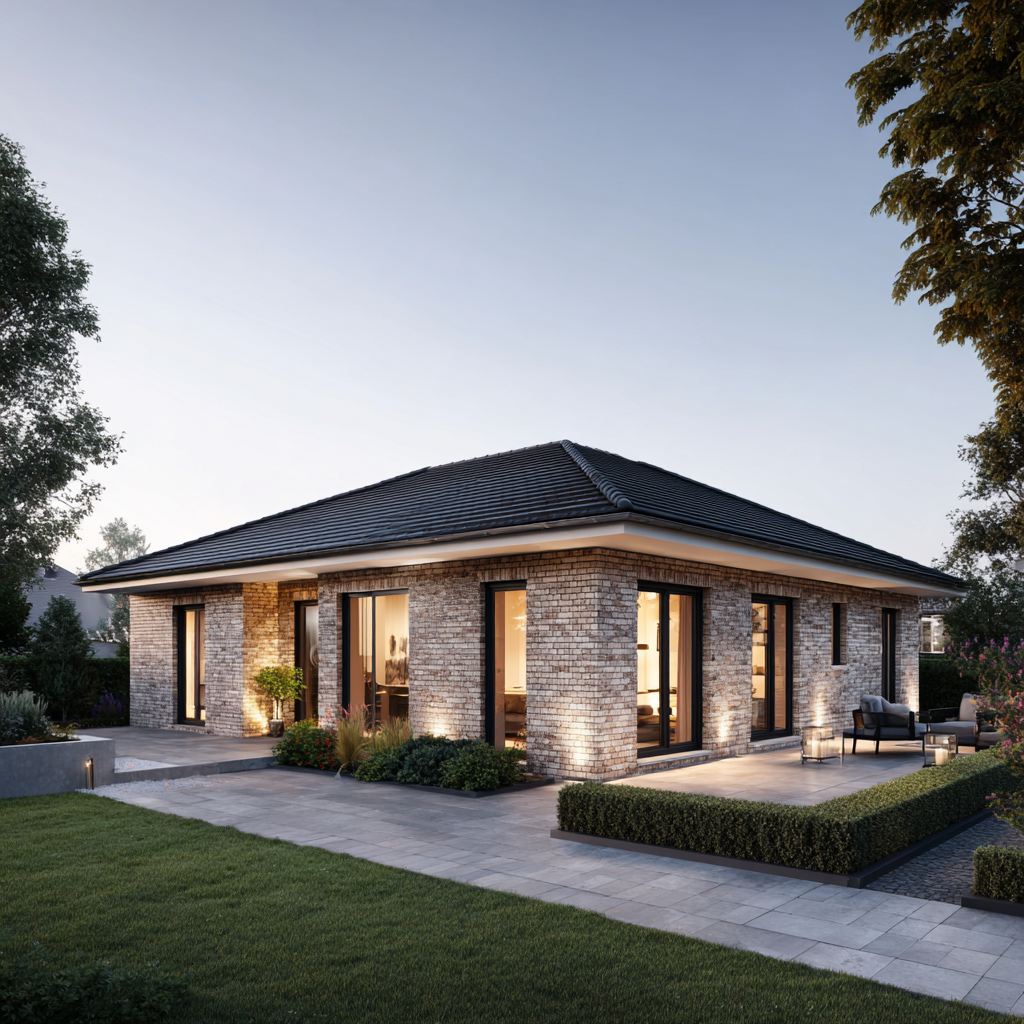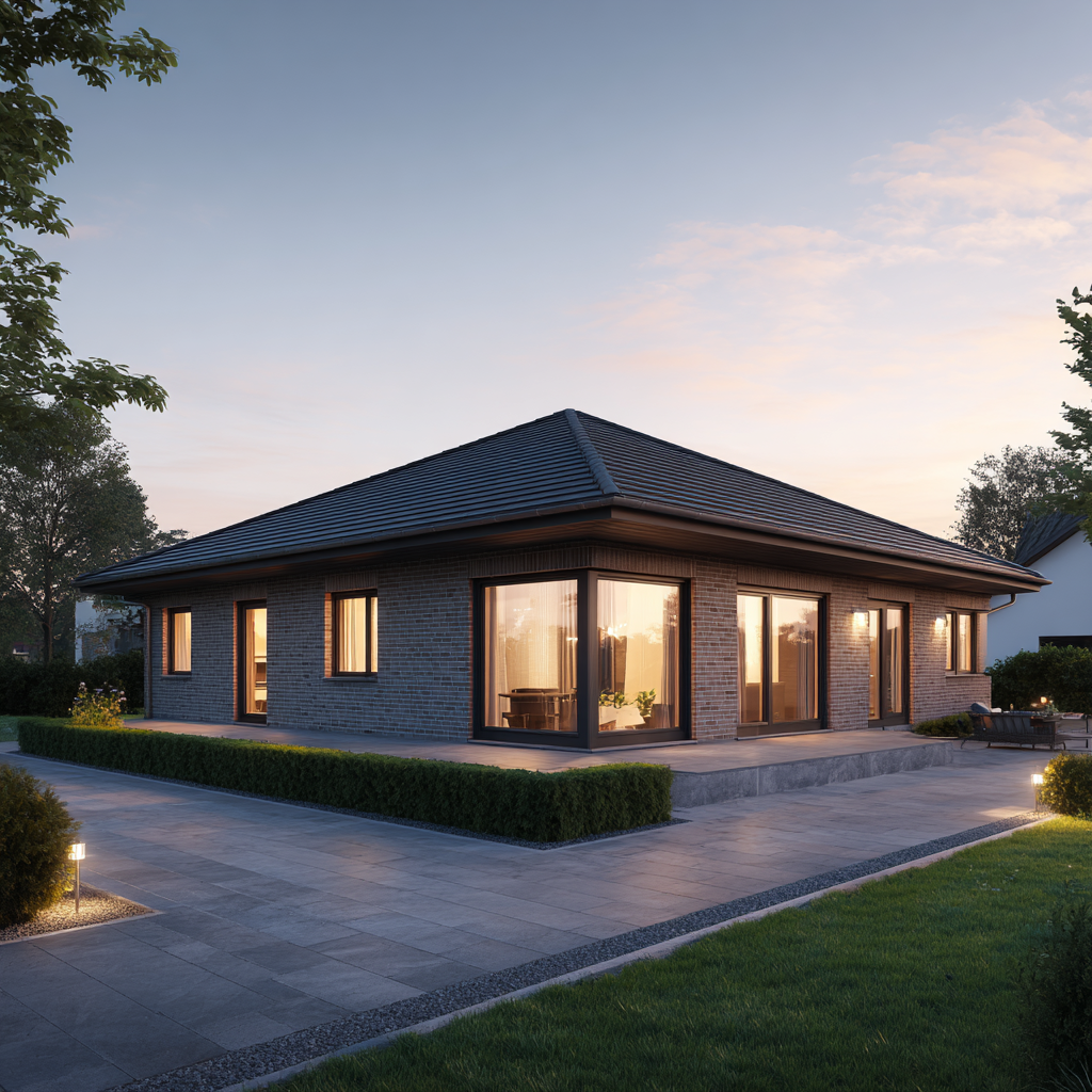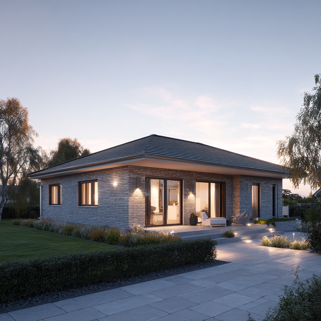 Wer sich ein Zuhause wünscht, das Ruhe, Offenheit und Sicherheit vereint, findet im Bungalow „Dünenblick 112“ den idealen Begleiter. Auf rund 112 Quadratmetern Wohnfläche entfaltet sich ein Wohngefühl, das typisch für den Norden ist – klar, beständig und lichtdurchflutet. Die Kombination aus sandbeigem Klinker, eleganten anthrazitfarbenen Fenstern und dem klassischen Walmdach verleiht dem Haus einen zeitlosen, harmonischen Charakter.