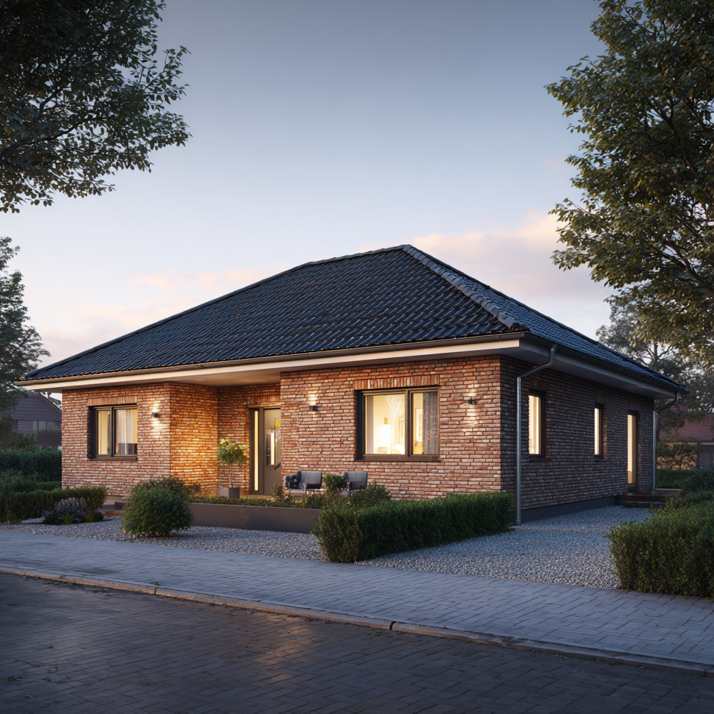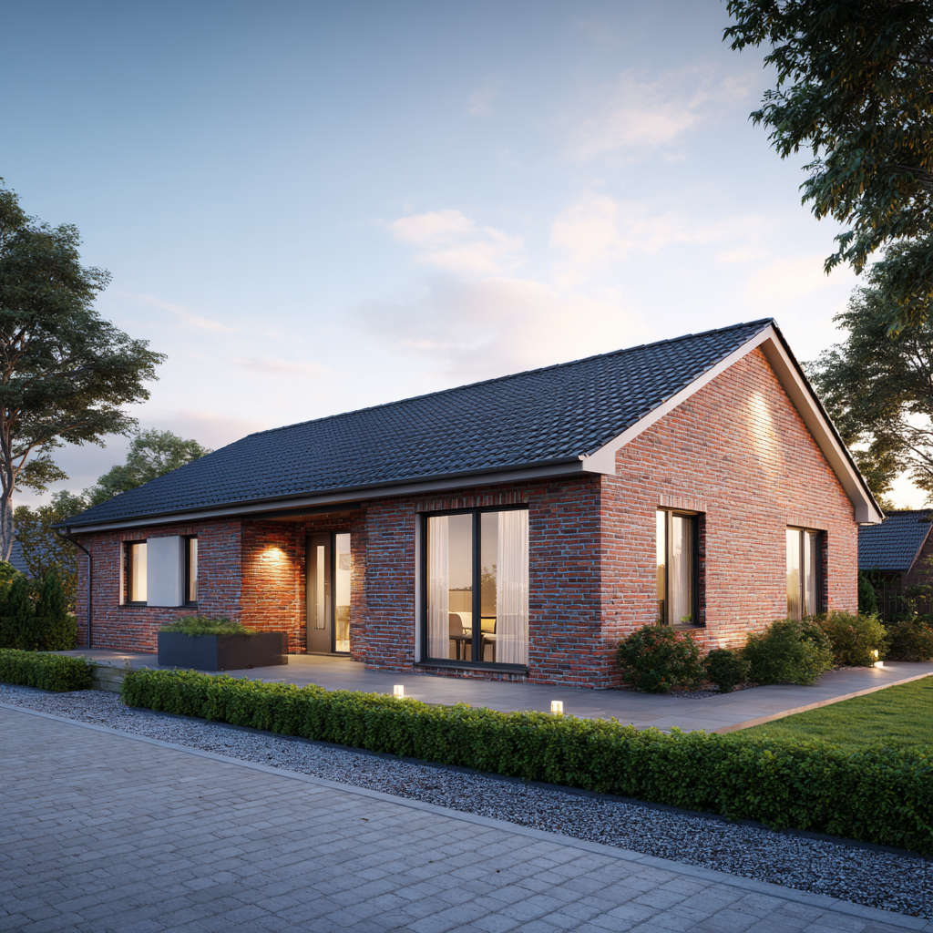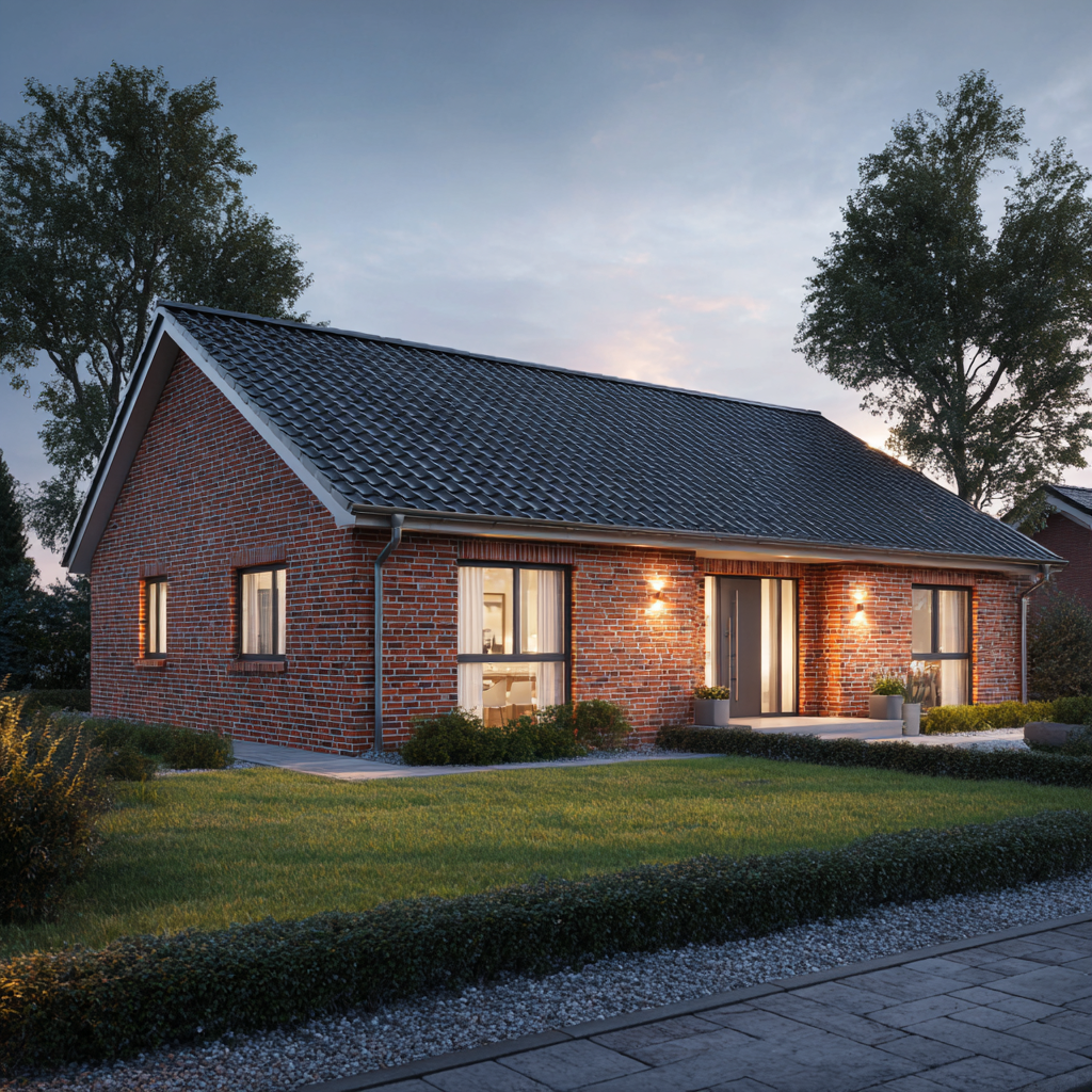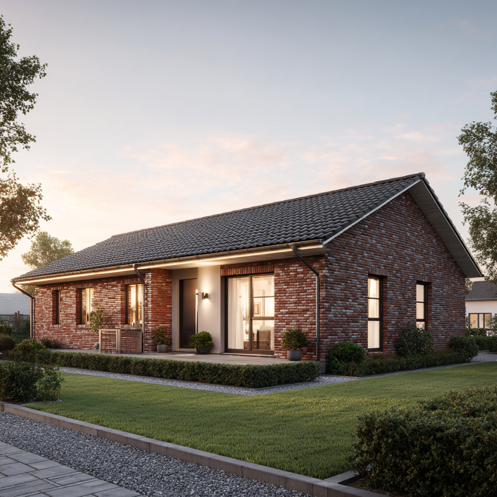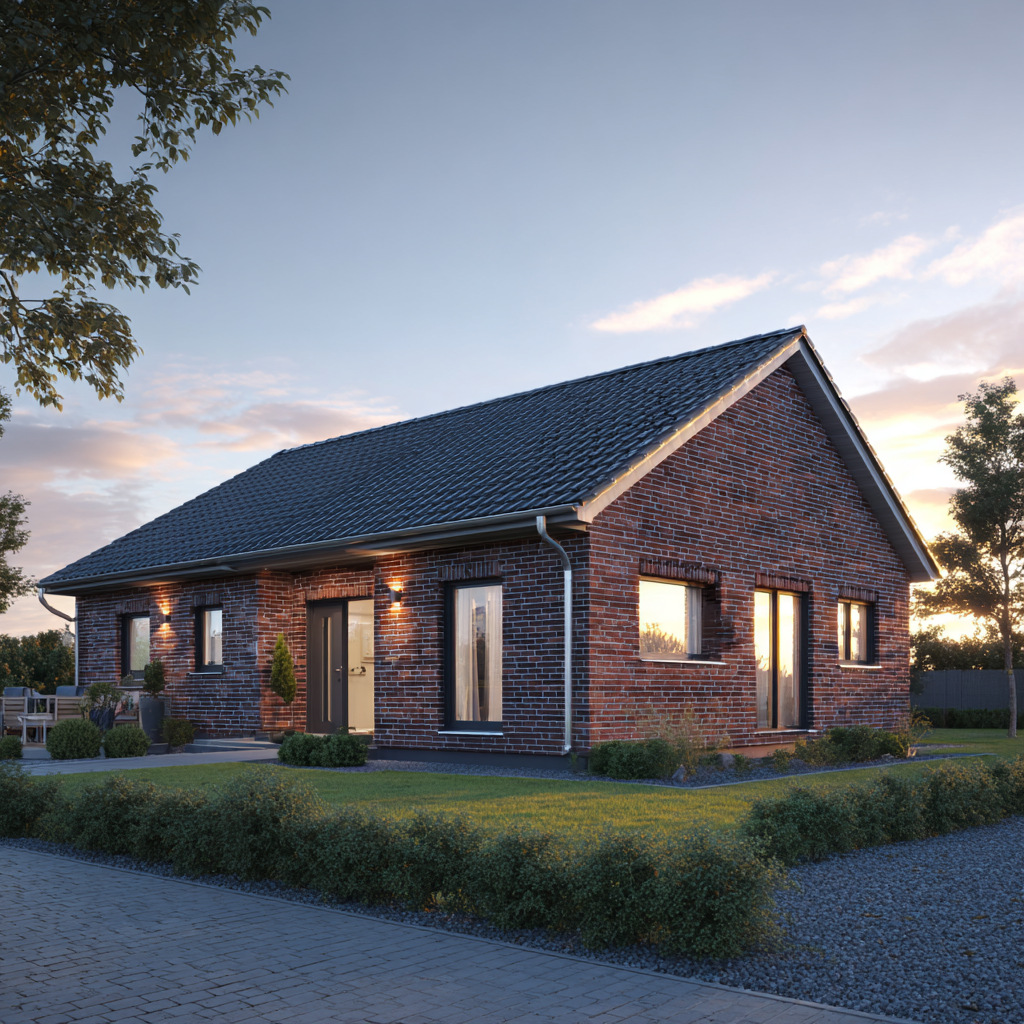 Wenn am Abend warmes Licht durch die Fenster fällt und die Klinkerfassade in goldenen Tönen schimmert, zeigt sich, was dieses Haus ausmacht: Beständigkeit, Geborgenheit und das gute Gefühl, angekommen zu sein. Der Bungalow „Hafenstein 90“ – kompakt im Grundriss, groß in seinen Werten.
