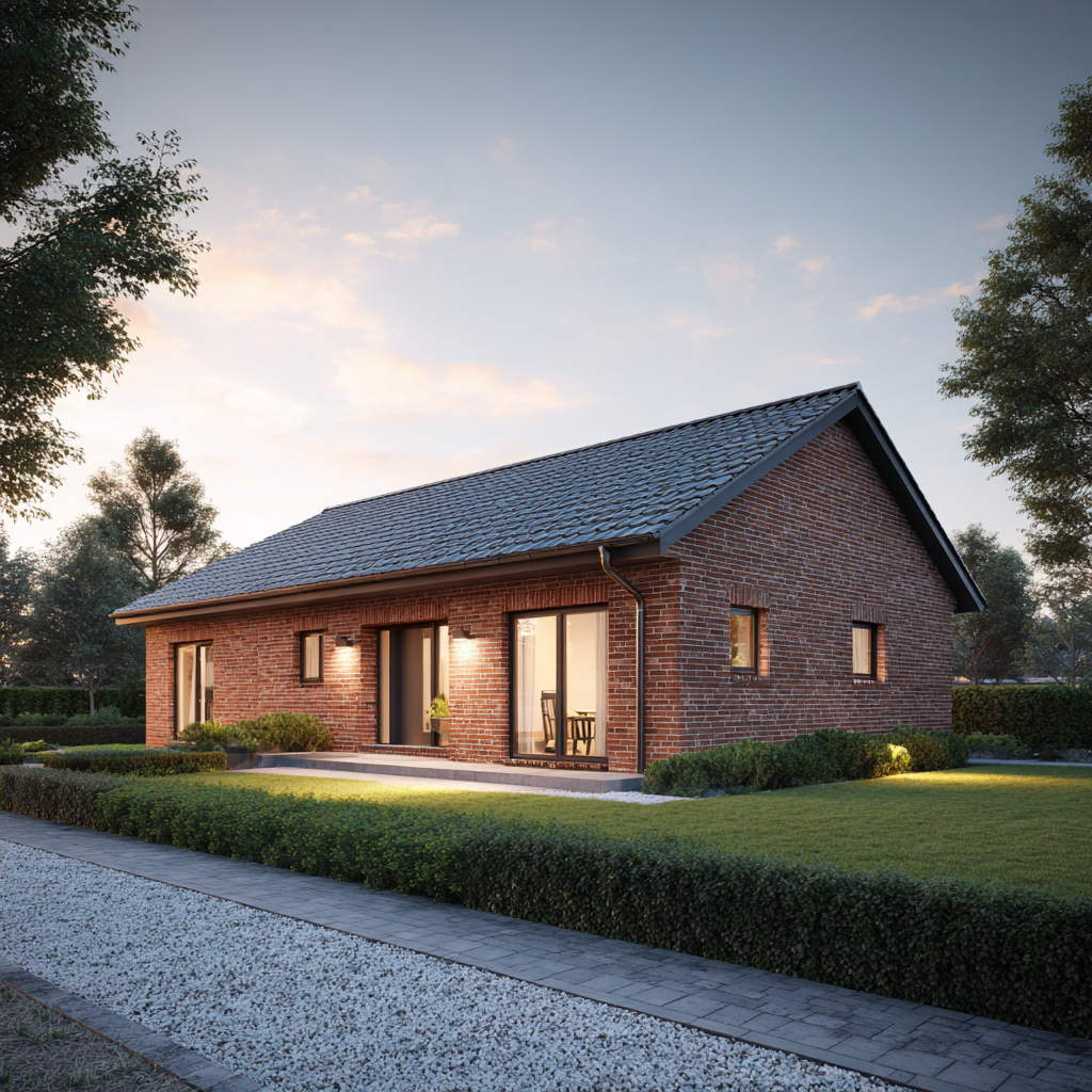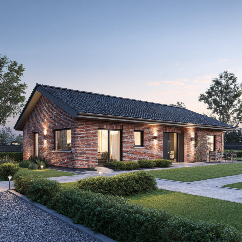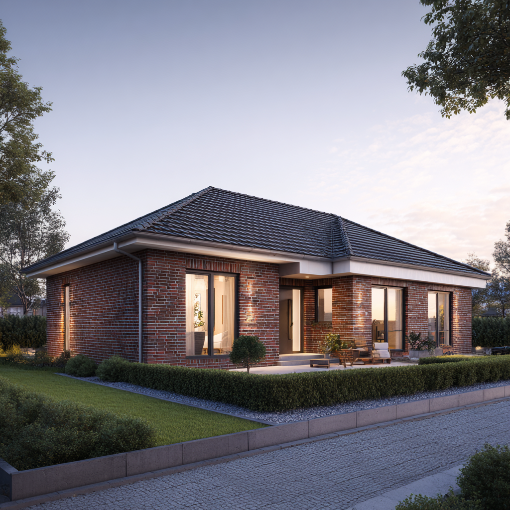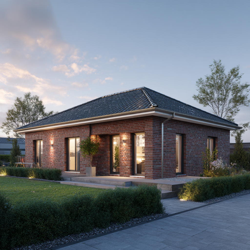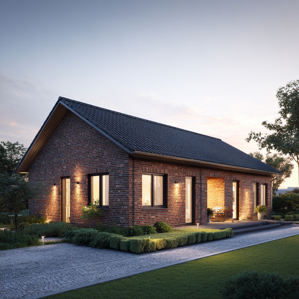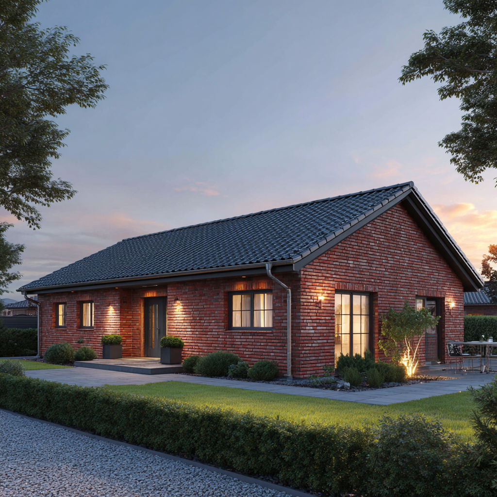 Wenn am Abend warmes Licht durch die Fenster fällt und die Klinkerfassade in goldenen Tönen schimmert, zeigt sich, was dieses Haus ausmacht: Beständigkeit, Geborgenheit und das gute Gefühl, angekommen zu sein. Der Bungalow „Hafenstein 90“ – kompakt im Grundriss, groß in seinen Werten.