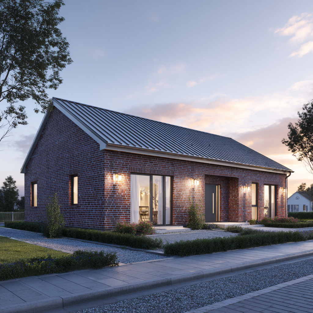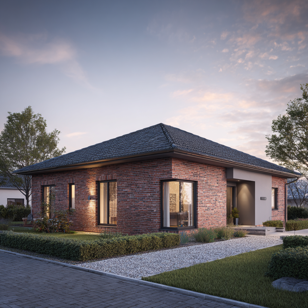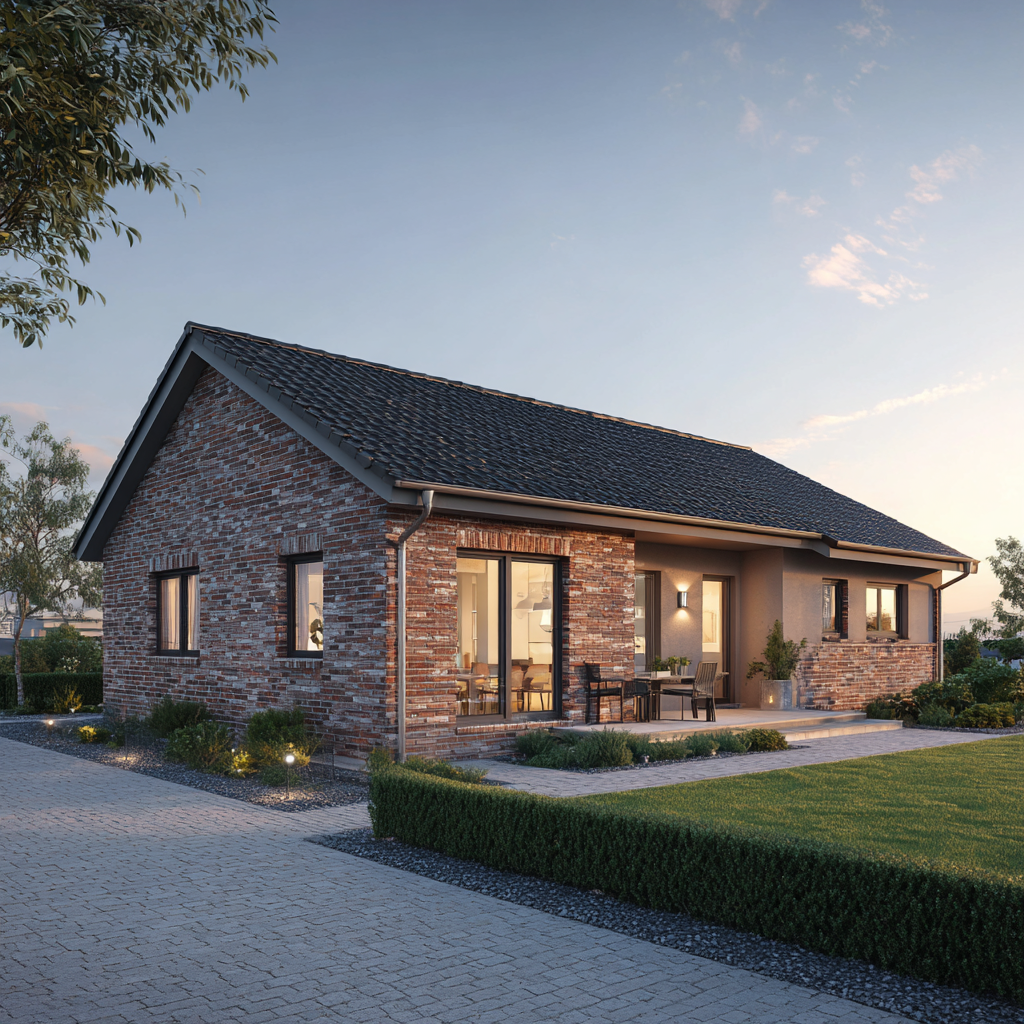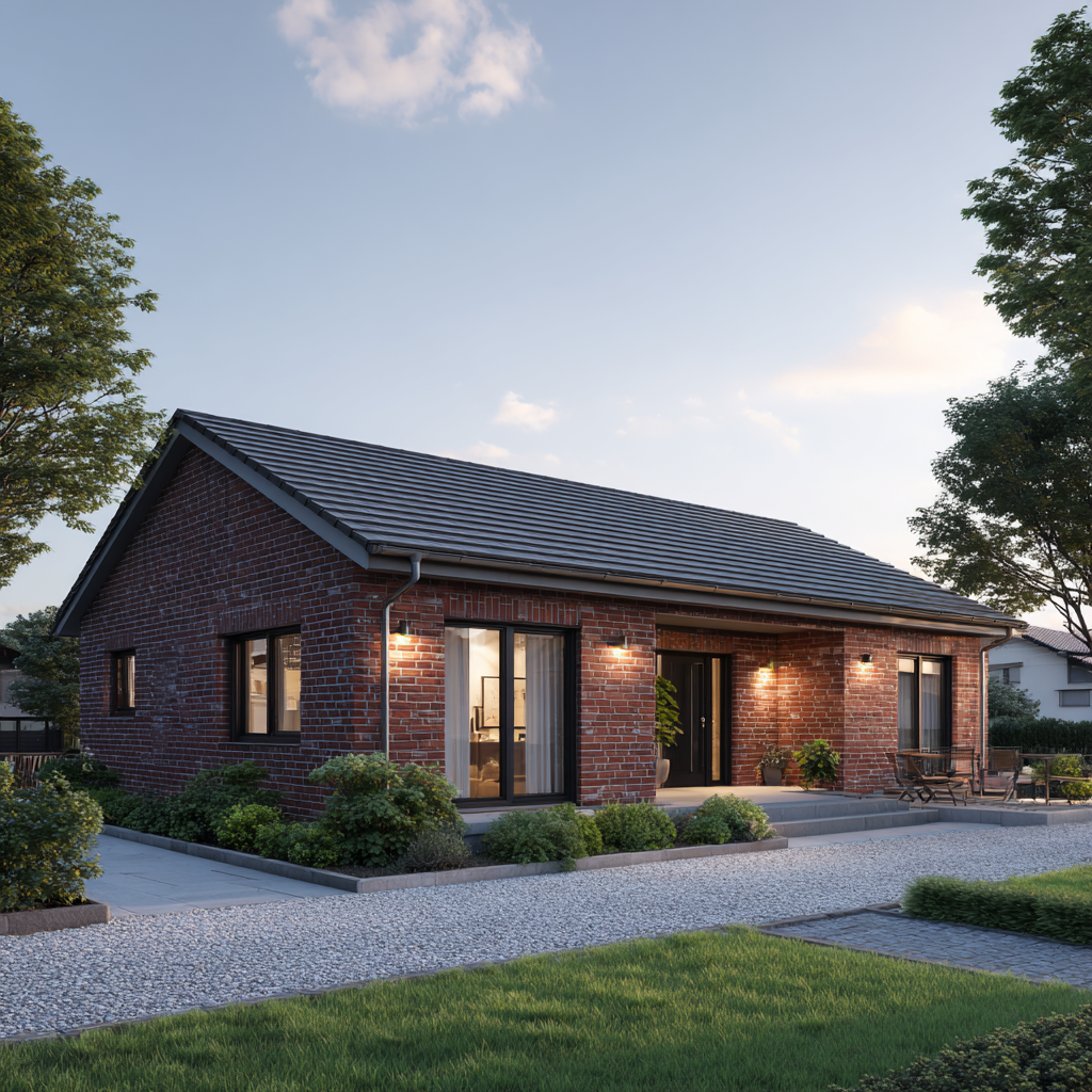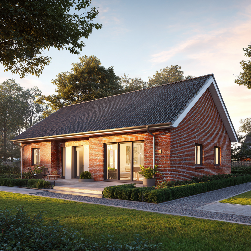 Wenn am Abend warmes Licht durch die Fenster fällt und die Klinkerfassade in goldenen Tönen schimmert, zeigt sich, was dieses Haus ausmacht: Beständigkeit, Geborgenheit und das gute Gefühl, angekommen zu sein. Der Bungalow „Hafenstein 90“ – kompakt im Grundriss, groß in seinen Werten.