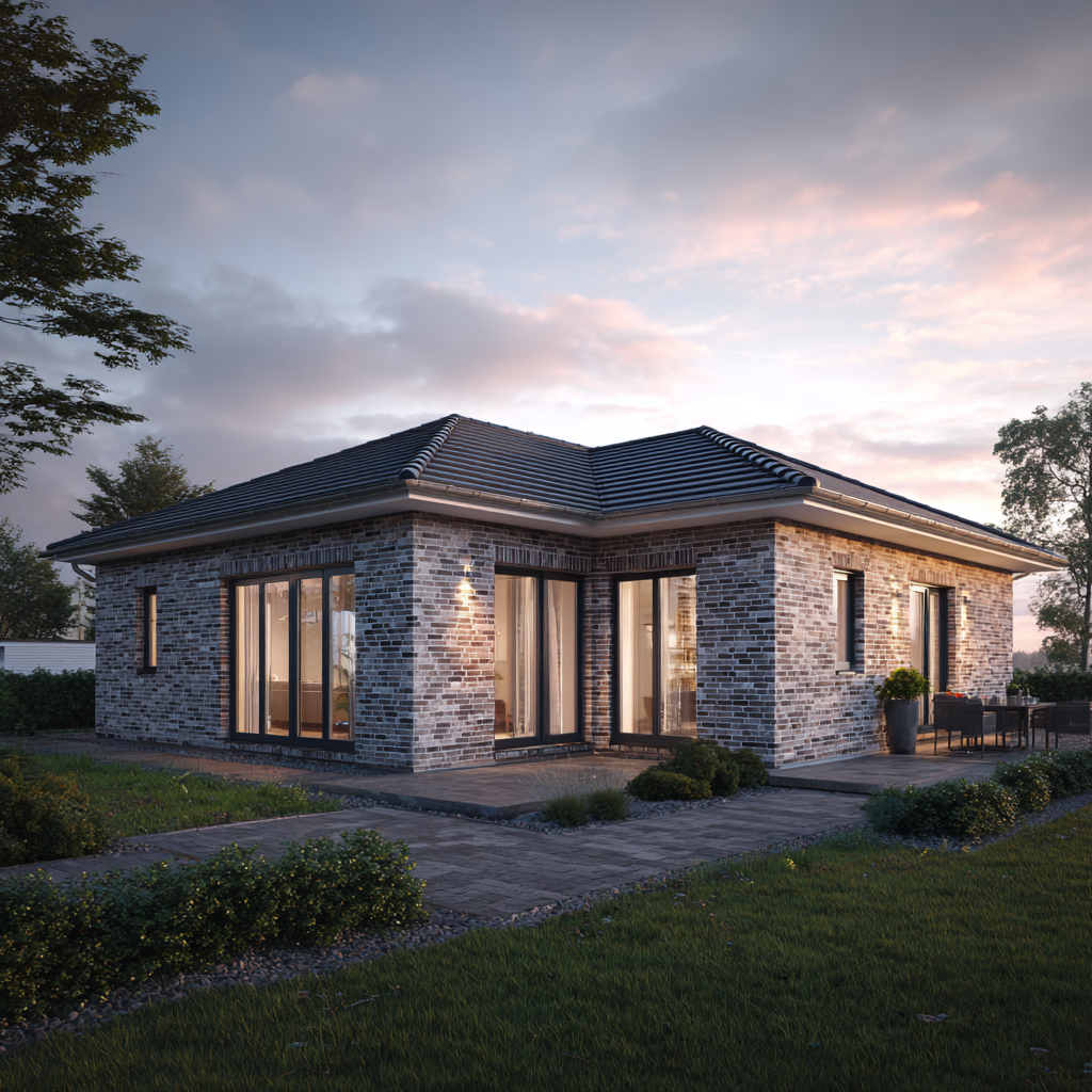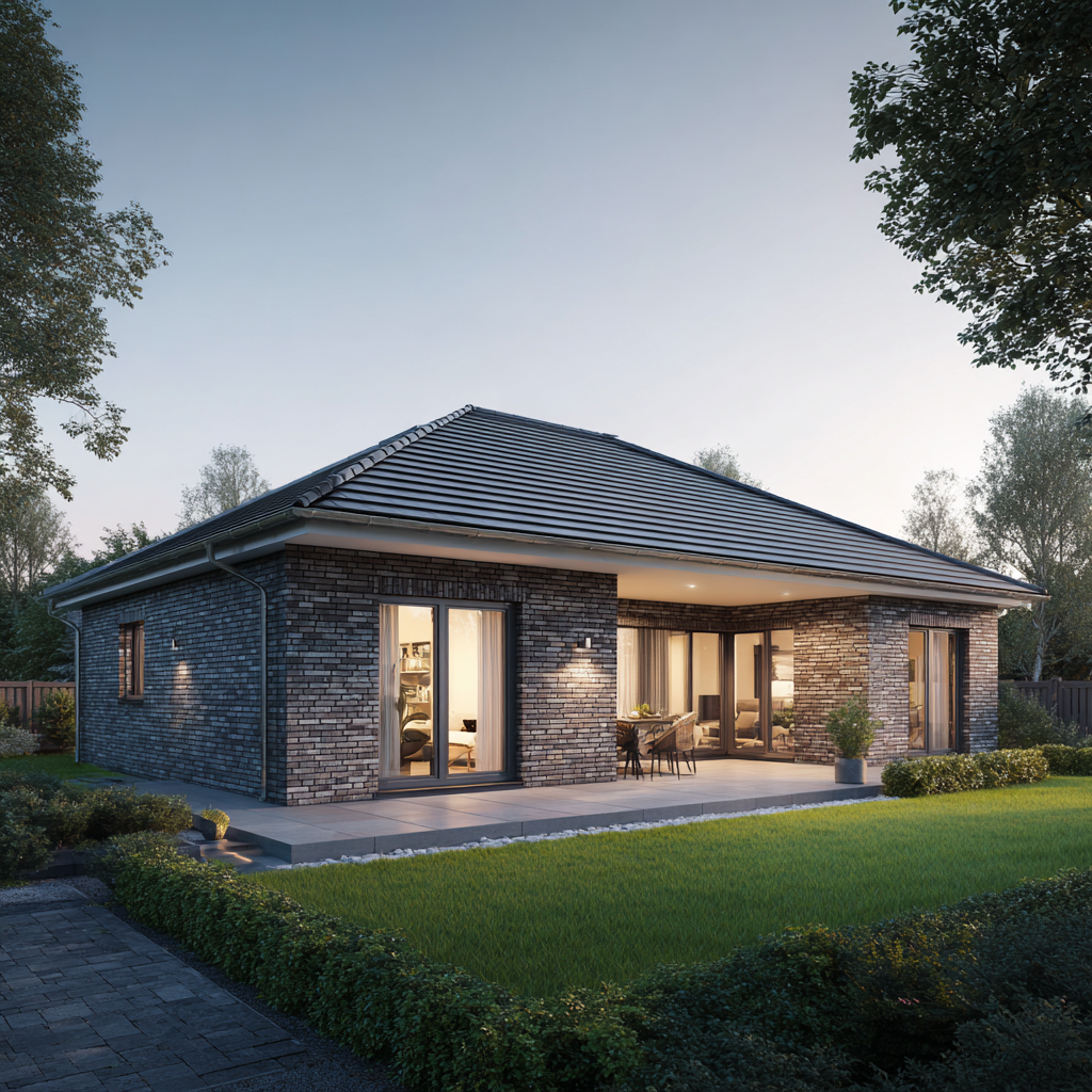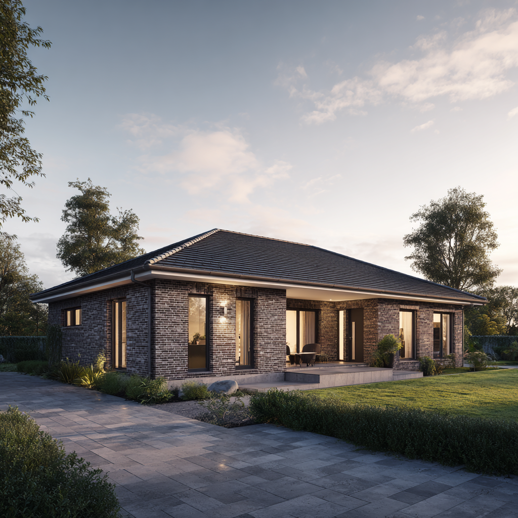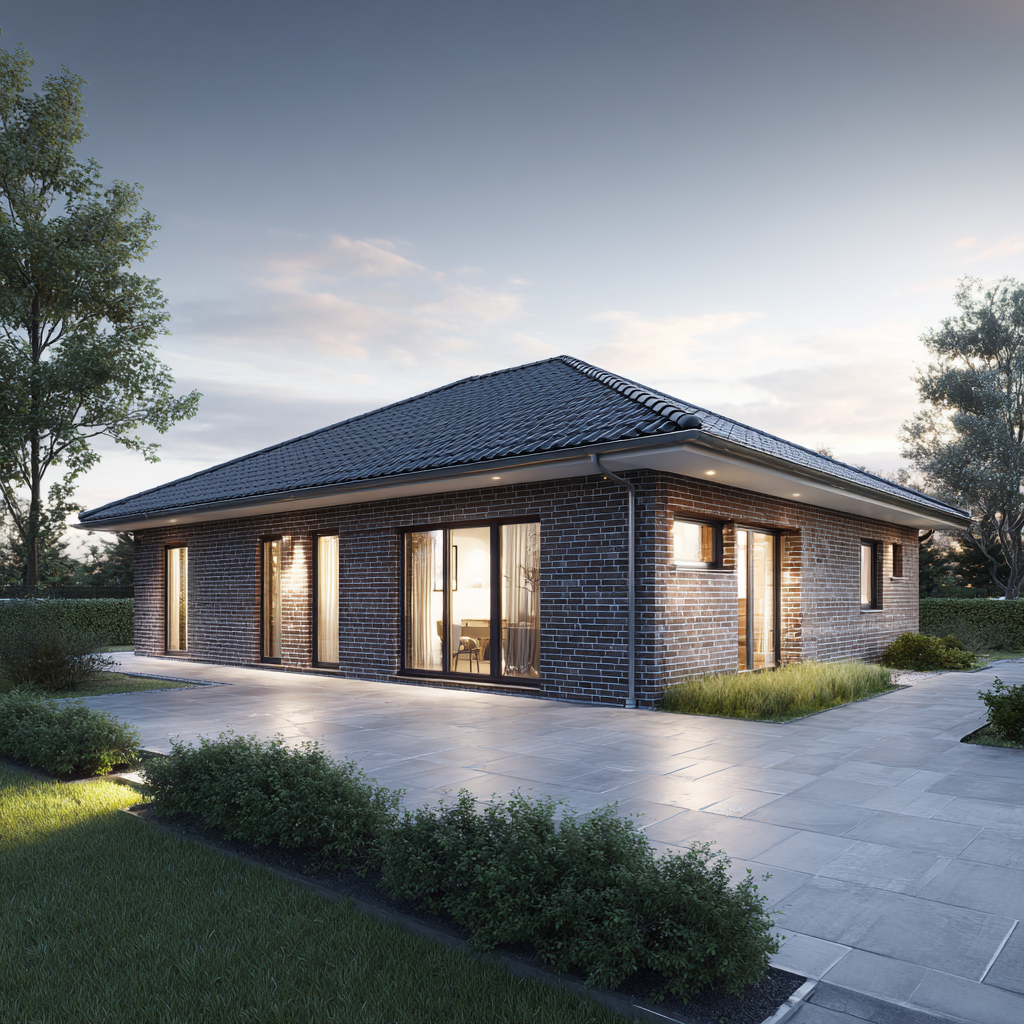 Der Bungalow „Hafflicht 130“ vereint großzügiges Wohnen auf einer Ebene mit der Ruhe und Beständigkeit norddeutscher Klinkerarchitektur. Auf rund 130 Quadratmetern Wohnfläche entsteht ein Massivhaus mit klarer Grundrisslogik: ein weitläufiger Wohn-/Essbereich mit bodentiefen Terrassentüren, ein komfortables Elternschlafzimmer, zwei weitere Zimmer für Kinder, Gäste oder Homeoffice, ein modernes Bad, Gäste-WC sowie ein praktischer Hauswirtschaftsraum. Außen prägen anthrazitfarbener Klinker, weiße Fensterrahmen und ein elegantes Walmdach das Bild – wertig, zeitlos und ideal für das norddeutsche Klima.