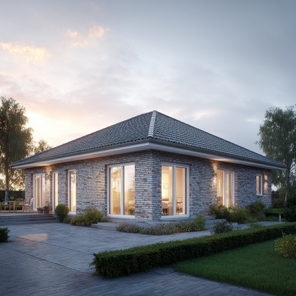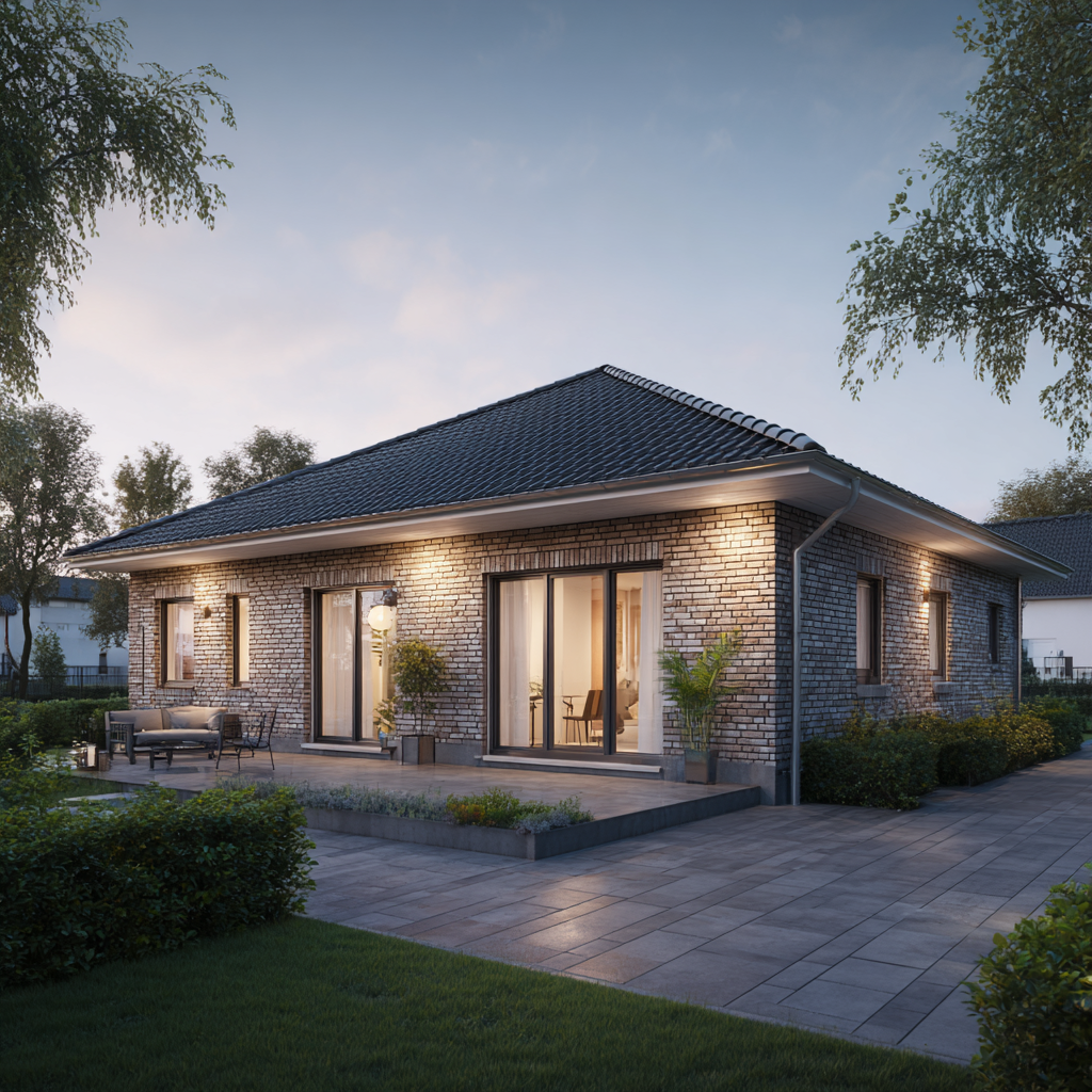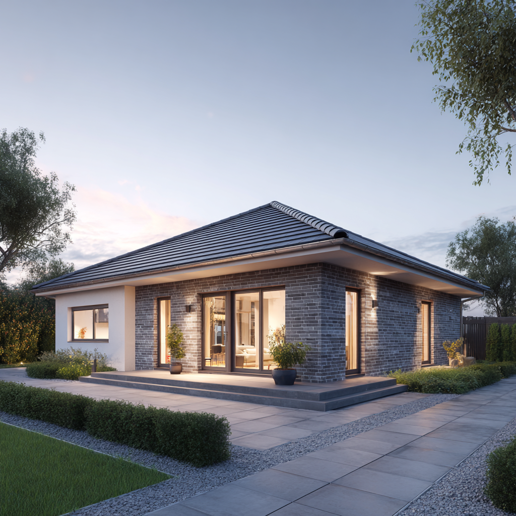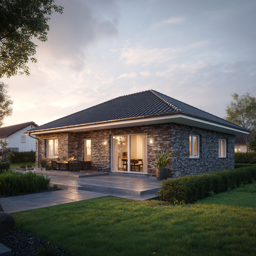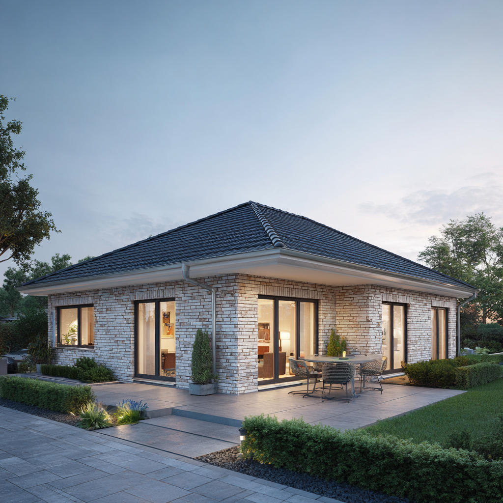 Der Bungalow „Hafflicht 130“ vereint großzügiges Wohnen auf einer Ebene mit der Ruhe und Beständigkeit norddeutscher Klinkerarchitektur. Auf rund 130 Quadratmetern Wohnfläche entsteht ein Massivhaus mit klarer Grundrisslogik: ein weitläufiger Wohn-/Essbereich mit bodentiefen Terrassentüren, ein komfortables Elternschlafzimmer, zwei weitere Zimmer für Kinder, Gäste oder Homeoffice, ein modernes Bad, Gäste-WC sowie ein praktischer Hauswirtschaftsraum. Außen prägen anthrazitfarbener Klinker, weiße Fensterrahmen und ein elegantes Walmdach das Bild – wertig, zeitlos und ideal für das norddeutsche Klima.