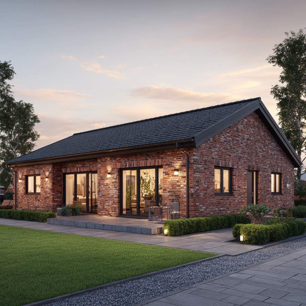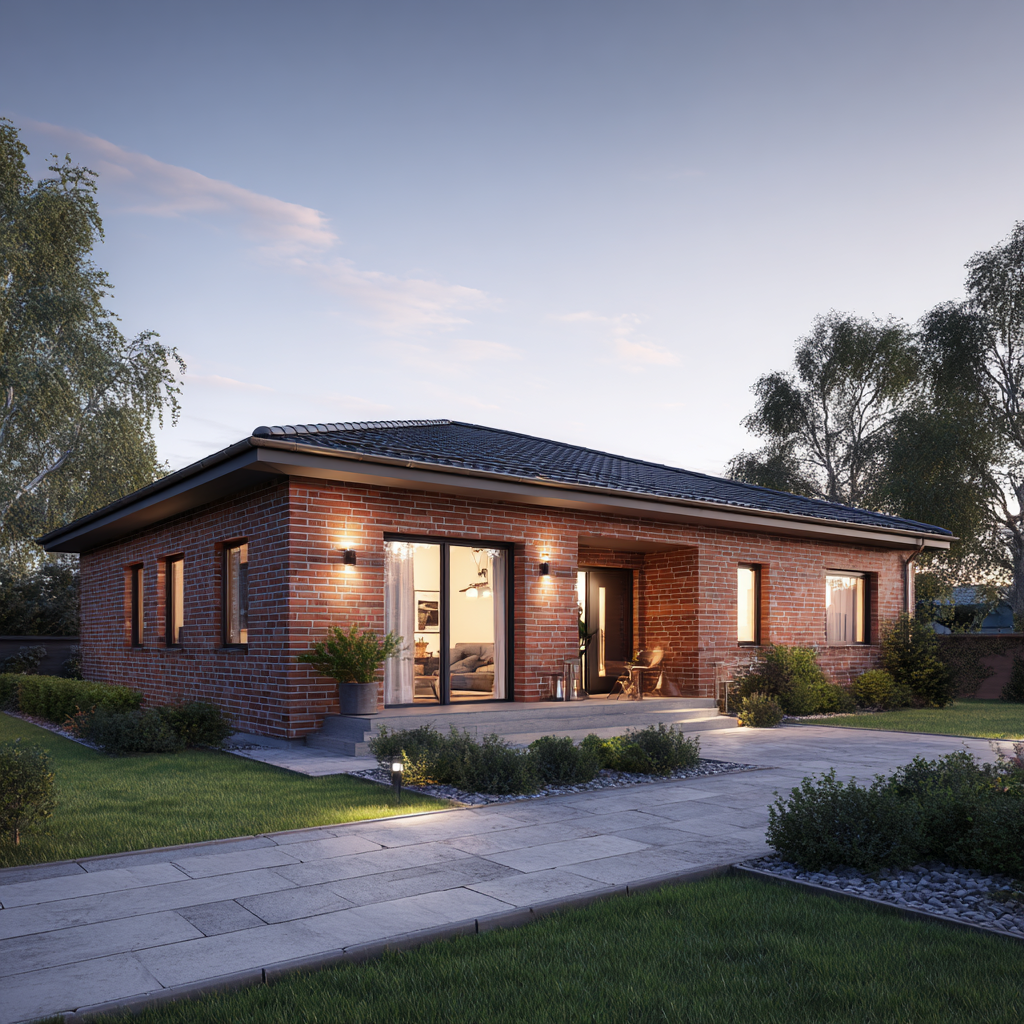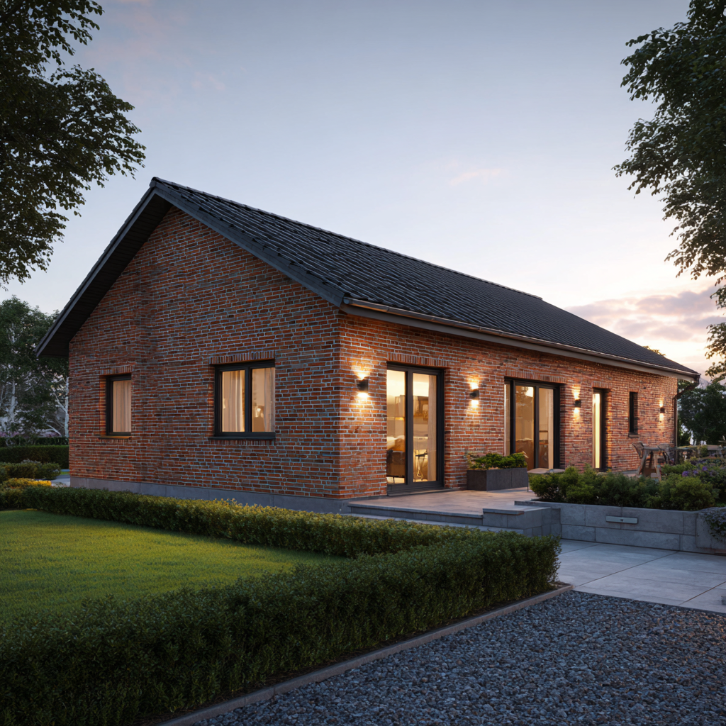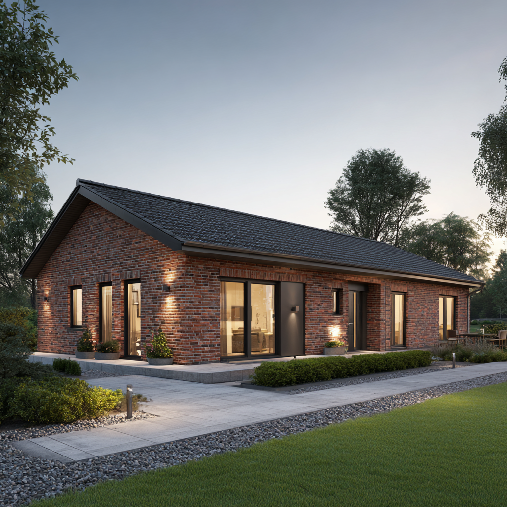 Der Bungalow „Küstenhain 104“ verbindet eine kompakte Größe mit echter Größe im Gefühl: klare Linien, ruhige Proportionen und die Beständigkeit norddeutscher Klinkerarchitektur. Auf rund 104 Quadratmetern Wohnfläche entsteht ein Massivhaus mit sinnvoller Raumaufteilung: ein heller Wohn-/Essbereich mit großen Gartentüren, zwei gut geschnittene Schlafzimmer, ein modernes Bad, ein Hauswirtschaftsraum sowie eine zentrale Diele, die kurze Wege schafft. Außen prägen rotbrauner Klinker, anthrazitfarbene Fenster und das Satteldach ein zeitloses Erscheinungsbild – solide, gepflegt, authentisch.