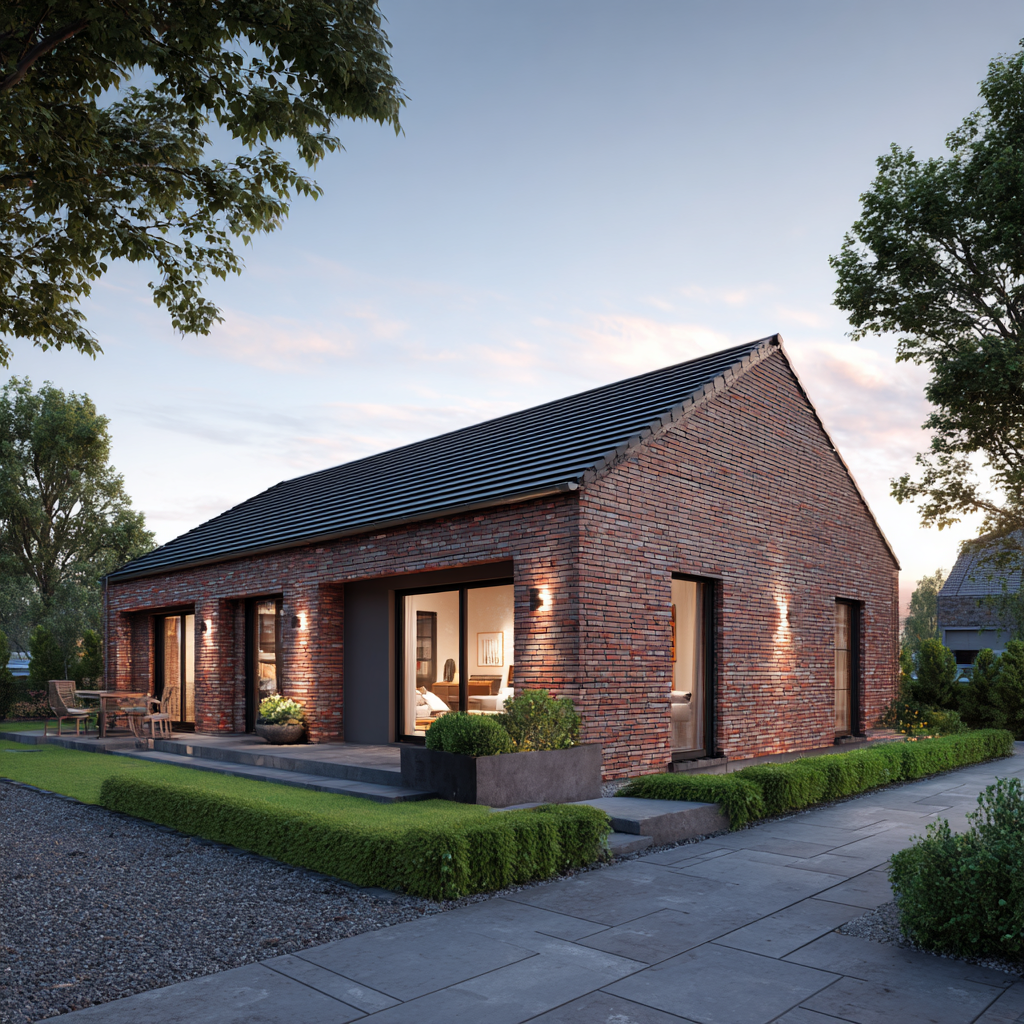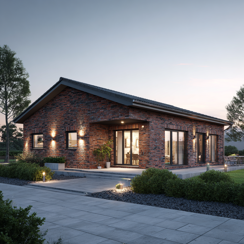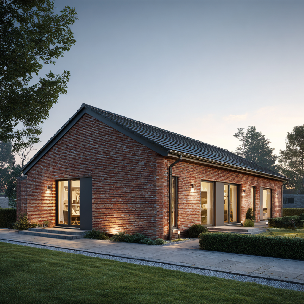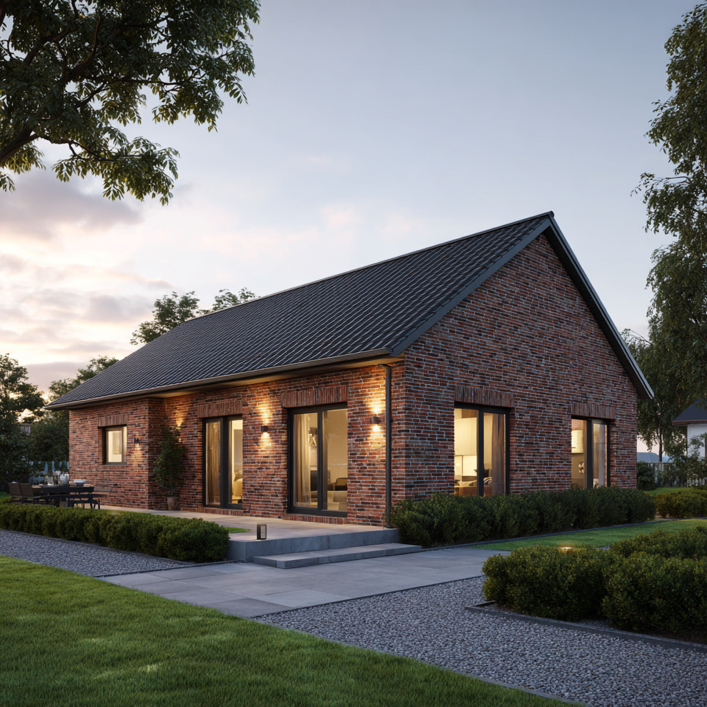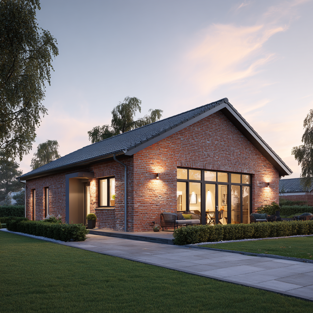 Der Bungalow „Küstenhain 104“ verbindet eine kompakte Größe mit echter Größe im Gefühl: klare Linien, ruhige Proportionen und die Beständigkeit norddeutscher Klinkerarchitektur. Auf rund 104 Quadratmetern Wohnfläche entsteht ein Massivhaus mit sinnvoller Raumaufteilung: ein heller Wohn-/Essbereich mit großen Gartentüren, zwei gut geschnittene Schlafzimmer, ein modernes Bad, ein Hauswirtschaftsraum sowie eine zentrale Diele, die kurze Wege schafft. Außen prägen rotbrauner Klinker, anthrazitfarbene Fenster und das Satteldach ein zeitloses Erscheinungsbild – solide, gepflegt, authentisch.