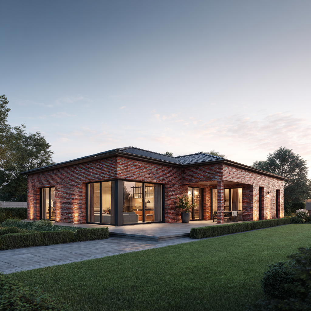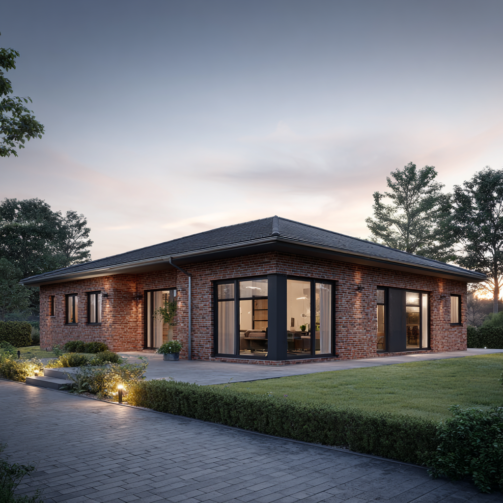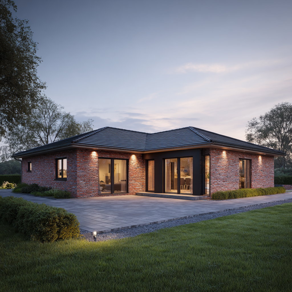 Der Bungalow „Nordperle 140“ ist die Antwort für alle, die großzügiges Wohnen auf einer Ebene mit klarer Architektur und beständiger Qualität verbinden möchten. Auf rund 140 Quadratmetern entfaltet der Winkelbungalow (L-Form) eine ruhige, weite Atmosphäre: ein offener Wohn-/Essbereich mit bodentiefen Gartentüren, drei bis vier flexibel nutzbare Zimmer (z. B. Schlafen, Kinder, Gäste oder Homeoffice), ein komfortables Bad, Gäste-WC sowie ein Hauswirtschaftsraum. Außen prägen hellgrau-beiger Klinker, tiefschwarze Fensterrahmen und das elegante Walmdach das Erscheinungsbild – nordisch, hochwertig, zeitlos. Die geschützte Eck-Terrasse im Winkel wird zum privaten Außenraum für lange Abende im goldenen Licht.