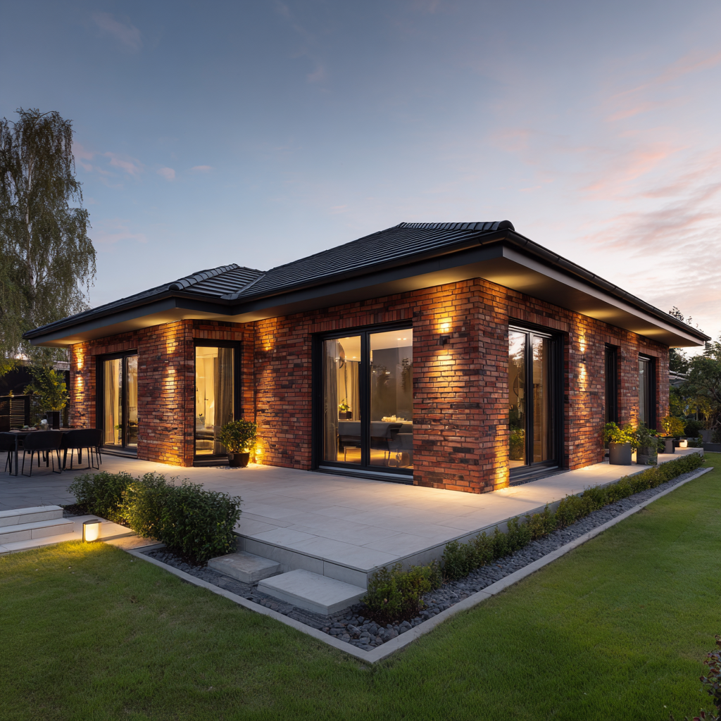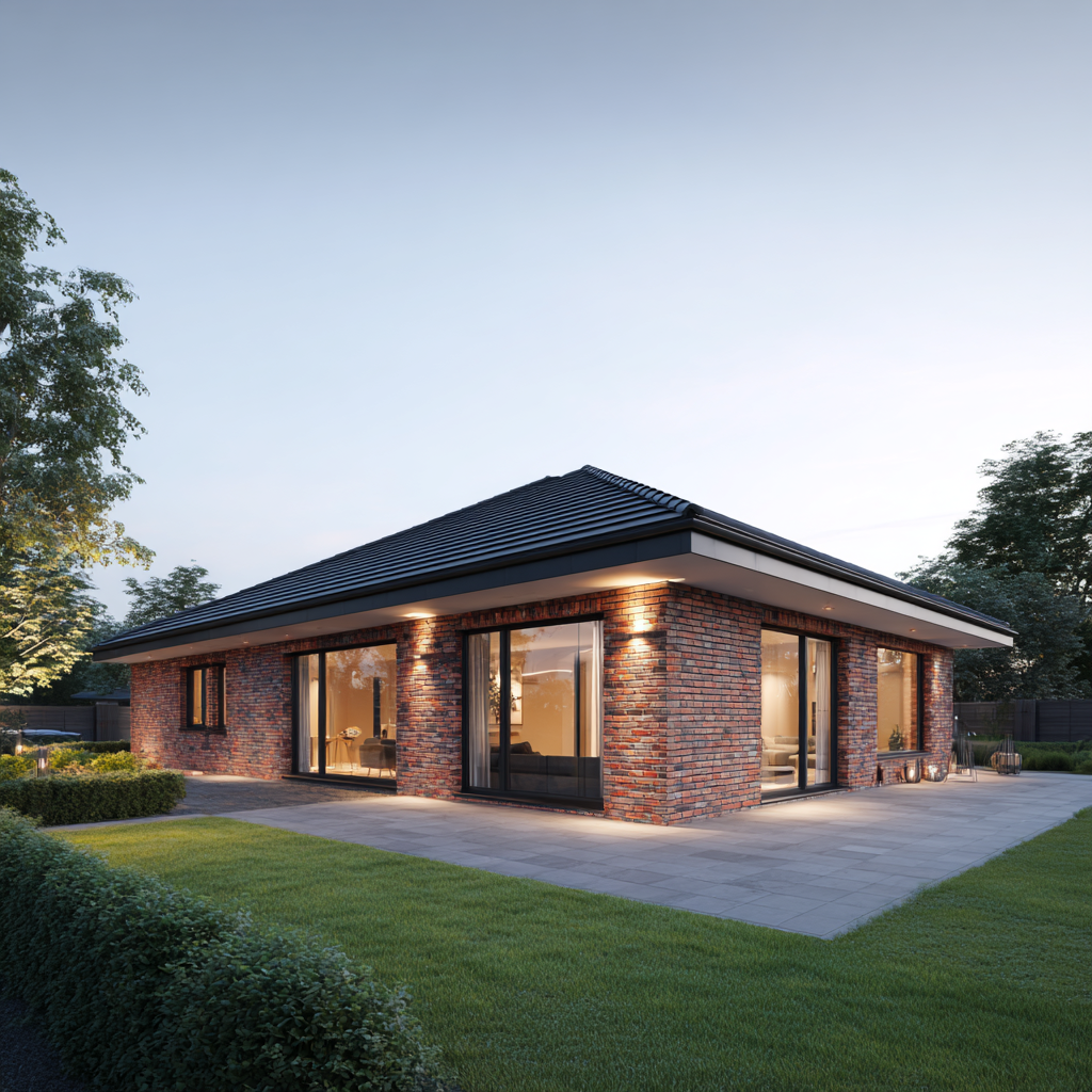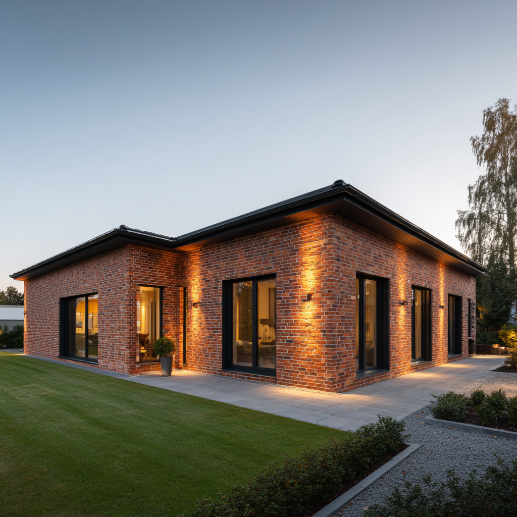 Der Bungalow „Nordperle 140“ ist die Antwort für alle, die großzügiges Wohnen auf einer Ebene mit klarer Architektur und beständiger Qualität verbinden möchten. Auf rund 140 Quadratmetern entfaltet der Winkelbungalow (L-Form) eine ruhige, weite Atmosphäre: ein offener Wohn-/Essbereich mit bodentiefen Gartentüren, drei bis vier flexibel nutzbare Zimmer (z. B. Schlafen, Kinder, Gäste oder Homeoffice), ein komfortables Bad, Gäste-WC sowie ein Hauswirtschaftsraum. Außen prägen hellgrau-beiger Klinker, tiefschwarze Fensterrahmen und das elegante Walmdach das Erscheinungsbild – nordisch, hochwertig, zeitlos. Die geschützte Eck-Terrasse im Winkel wird zum privaten Außenraum für lange Abende im goldenen Licht.