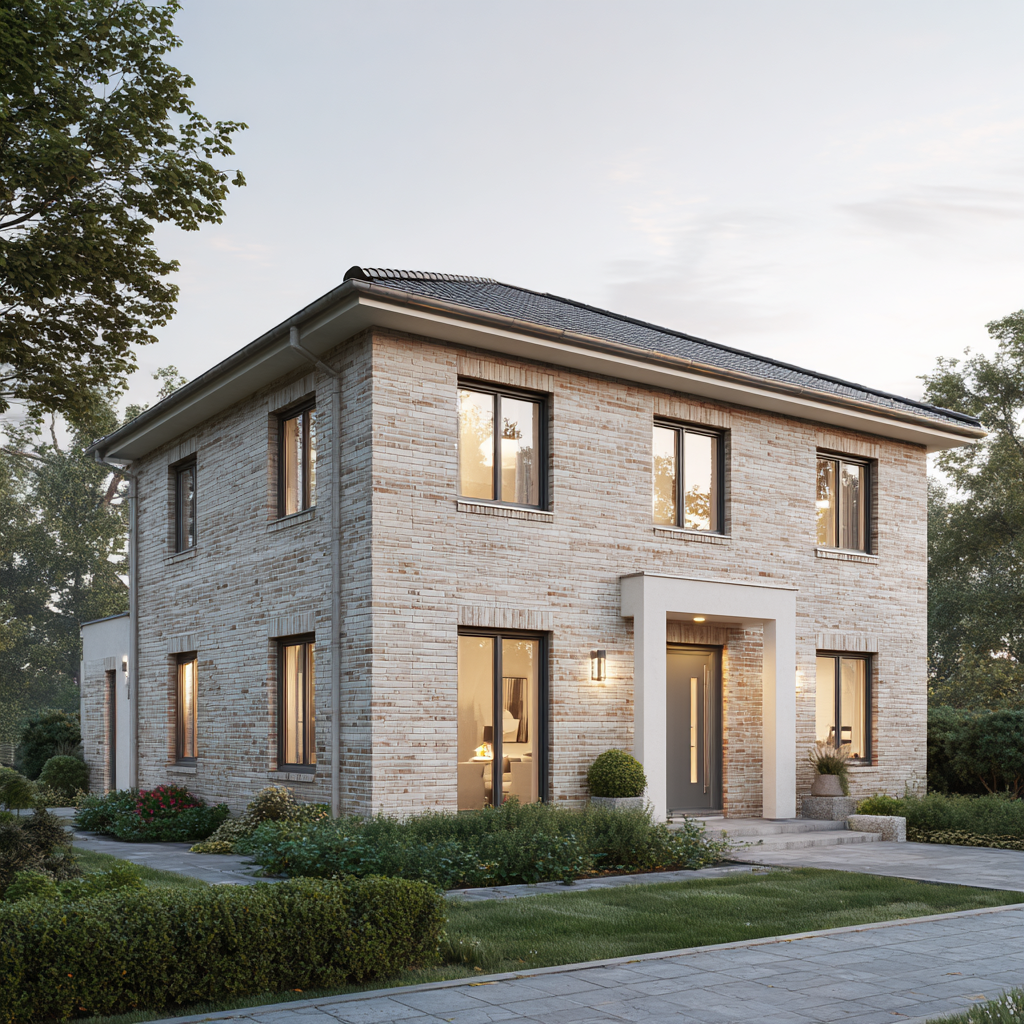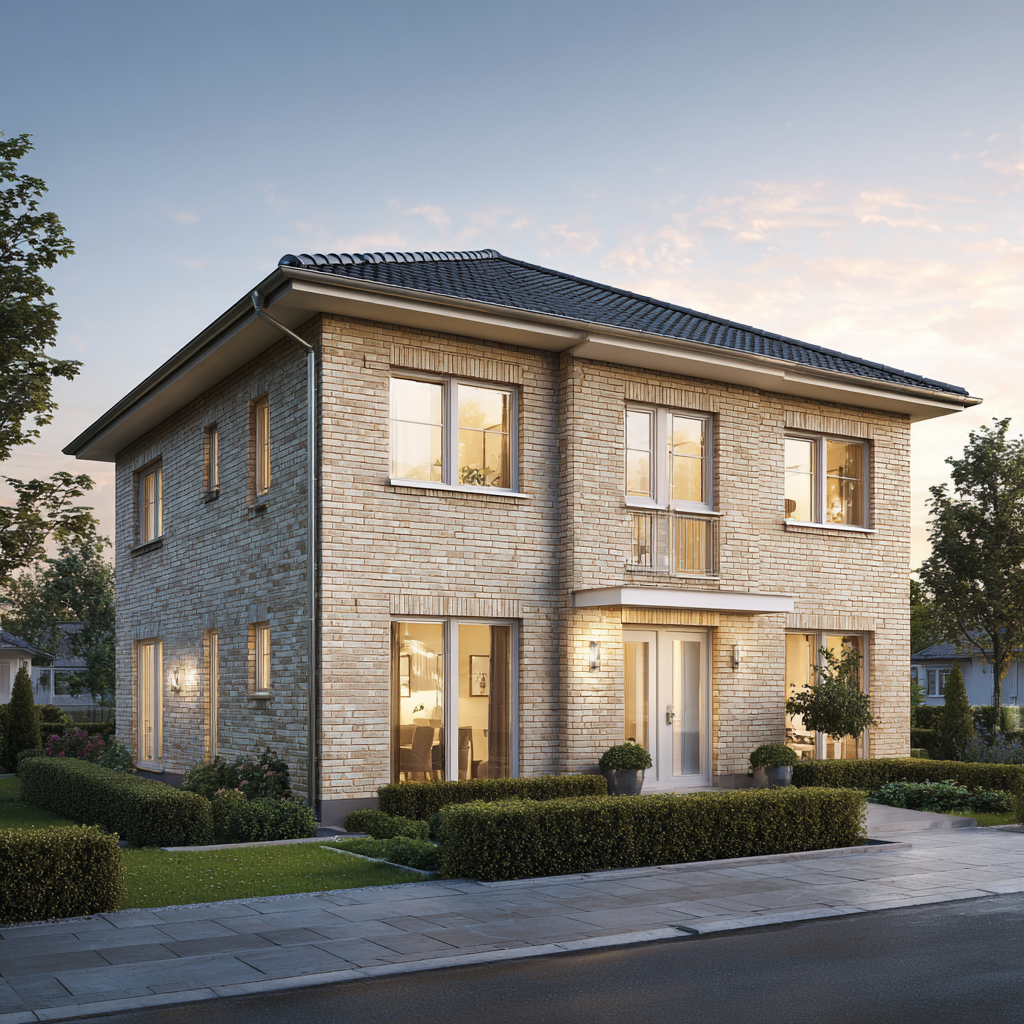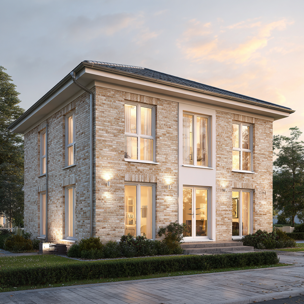 Das Dünenquartett 160 vereint geradlinige Moderne mit zeitloser Klinkerarchitektur. Die sandbeige Fassade, das ruhige Walmdach und die symmetrische Gliederung verleihen dem Haus eine souveräne Präsenz. Stein auf Stein gebaut, zeigt es die Qualität, die man sieht – und die Beständigkeit, die man spürt.