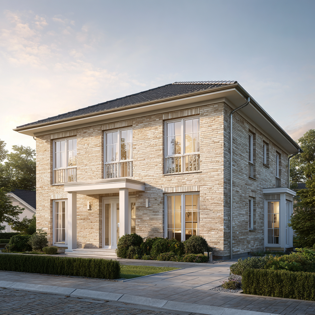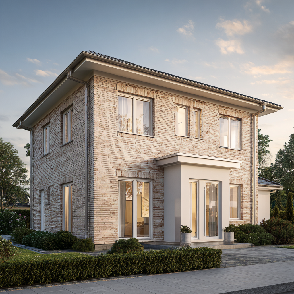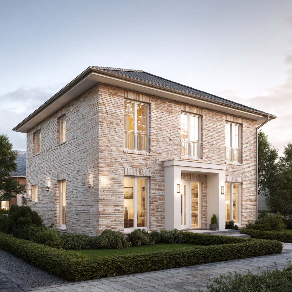 Das Dünenquartett 160 vereint geradlinige Moderne mit zeitloser Klinkerarchitektur. Die sandbeige Fassade, das ruhige Walmdach und die symmetrische Gliederung verleihen dem Haus eine souveräne Präsenz. Stein auf Stein gebaut, zeigt es die Qualität, die man sieht – und die Beständigkeit, die man spürt.