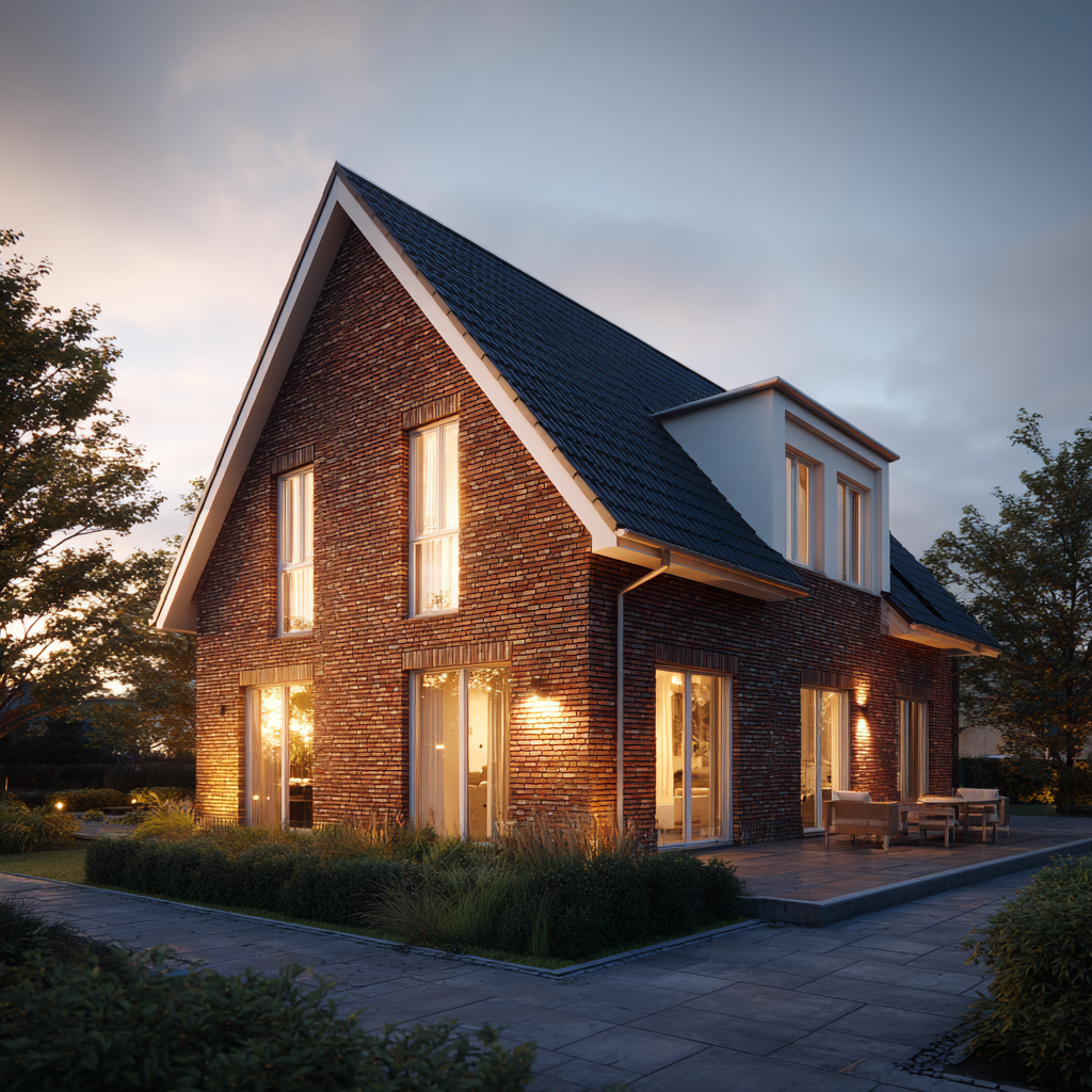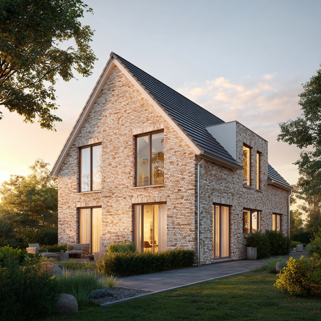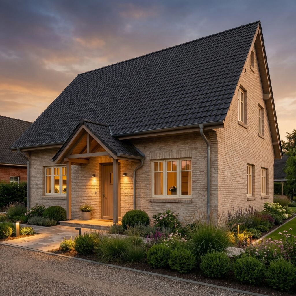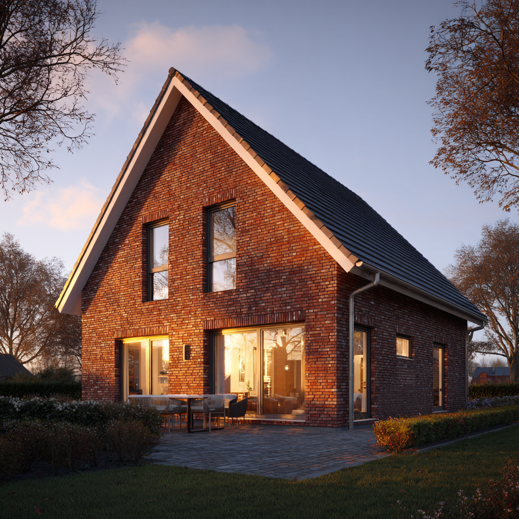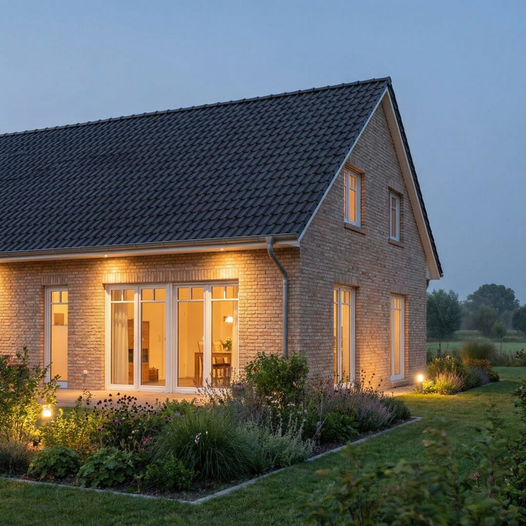 Wie alle Häuser von Mein Küstenhaus wird auch der „Wellenhof 128“ massiv Stein auf Stein gebaut. Diese Bauweise sorgt für langlebige Qualität, ein gesundes Raumklima und hohe Wertbeständigkeit. Unsere Festpreisgarantie schafft finanzielle Sicherheit, die Bauzeitgarantie sorgt für Planbarkeit und Entspannung während des gesamten Hausbaus. Wenn am Abend das warme Licht durch die Fenster fällt und die Klinkerfassade im Sonnengold leuchtet, entsteht das typische Gefühl von norddeutscher Ruhe und Ankommen – genau das, was ein Zuhause ausmacht.