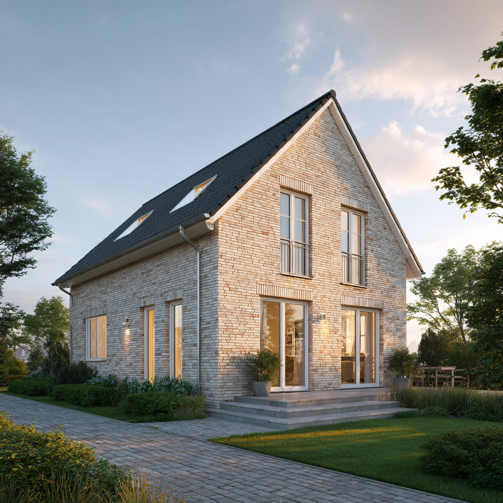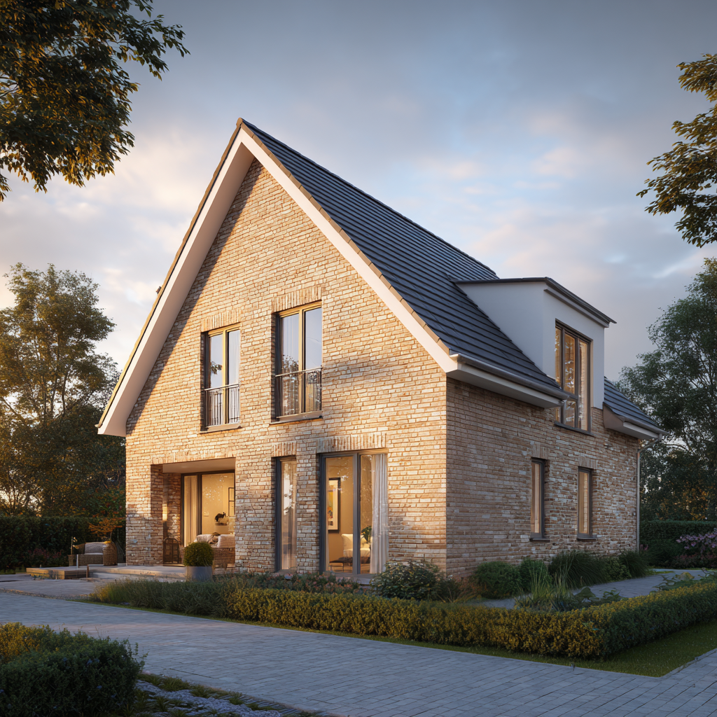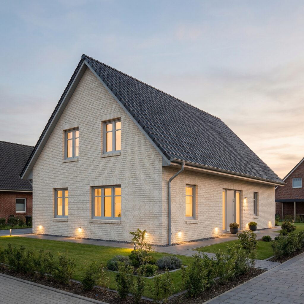 Das Einfamilienhaus „Wellenhof 128“ ist ein Zuhause, das die Leichtigkeit des Nordens in eine klare, moderne Architektur übersetzt. Mit 128 Quadratmetern Wohnfläche bietet es die perfekte Größe für Familien, die Wert auf Licht, Offenheit und Geborgenheit legen. Die sandbeige Klinkerfassade, die hellen Fensterrahmen und das klassische Satteldach verleihen dem Haus eine natürliche Wärme, die in der Golden Hour besonders eindrucksvoll zum Tragen kommt: Das weiche Licht des Abends taucht die Fassade in goldene Töne und lässt das Haus zu einem emotionalen Mittelpunkt werden.