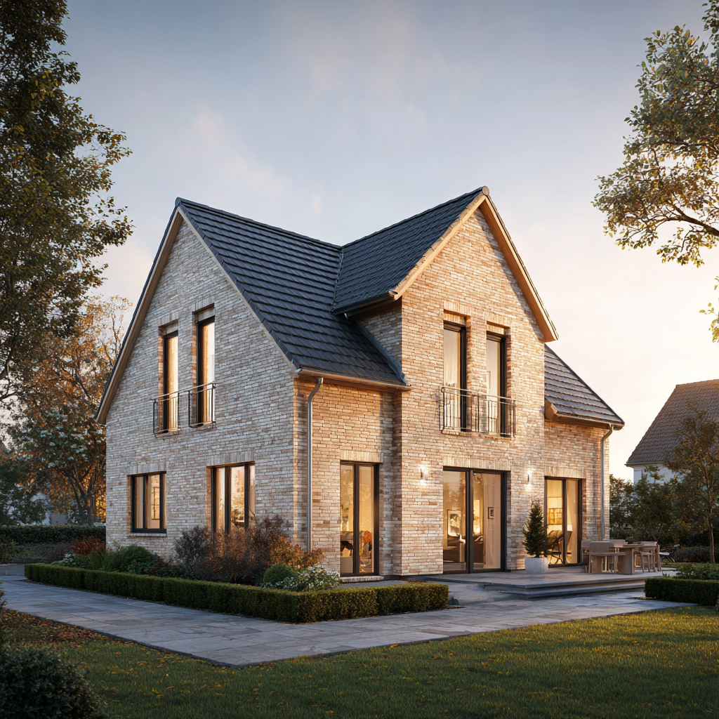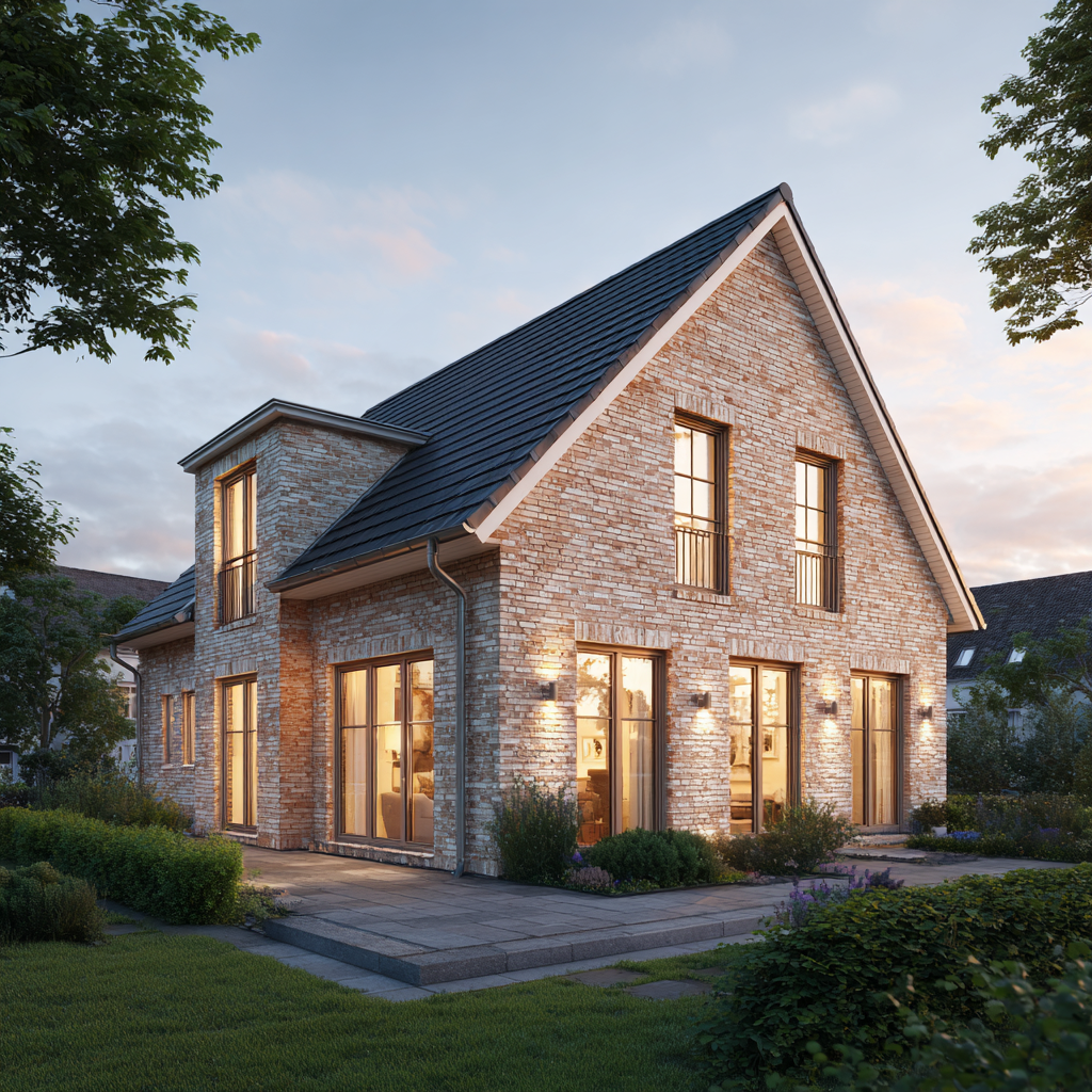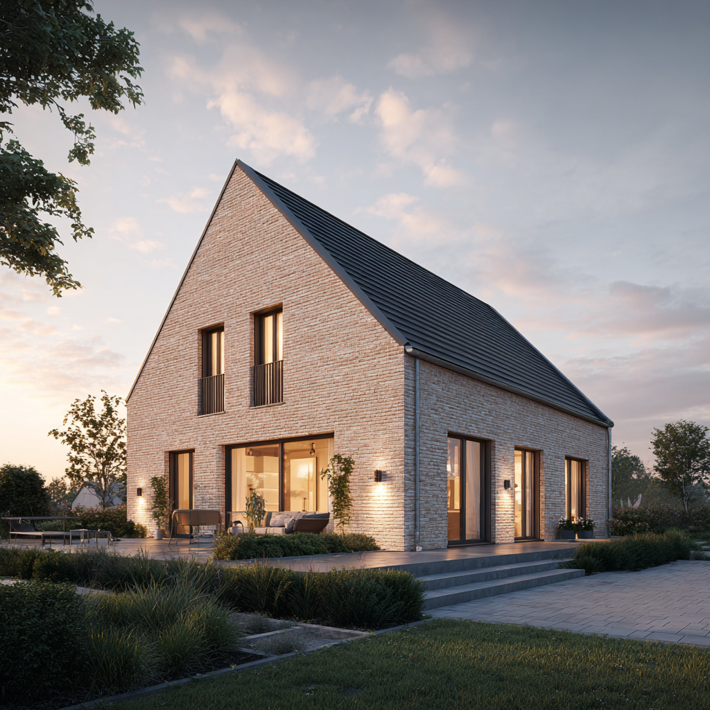 Das Einfamilienhaus „Wellenhof 128“ ist ein Zuhause, das die Leichtigkeit des Nordens in eine klare, moderne Architektur übersetzt. Mit 128 Quadratmetern Wohnfläche bietet es die perfekte Größe für Familien, die Wert auf Licht, Offenheit und Geborgenheit legen. Die sandbeige Klinkerfassade, die hellen Fensterrahmen und das klassische Satteldach verleihen dem Haus eine natürliche Wärme, die in der Golden Hour besonders eindrucksvoll zum Tragen kommt: Das weiche Licht des Abends taucht die Fassade in goldene Töne und lässt das Haus zu einem emotionalen Mittelpunkt werden.