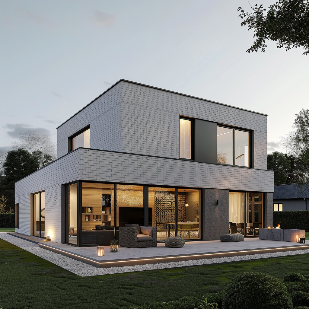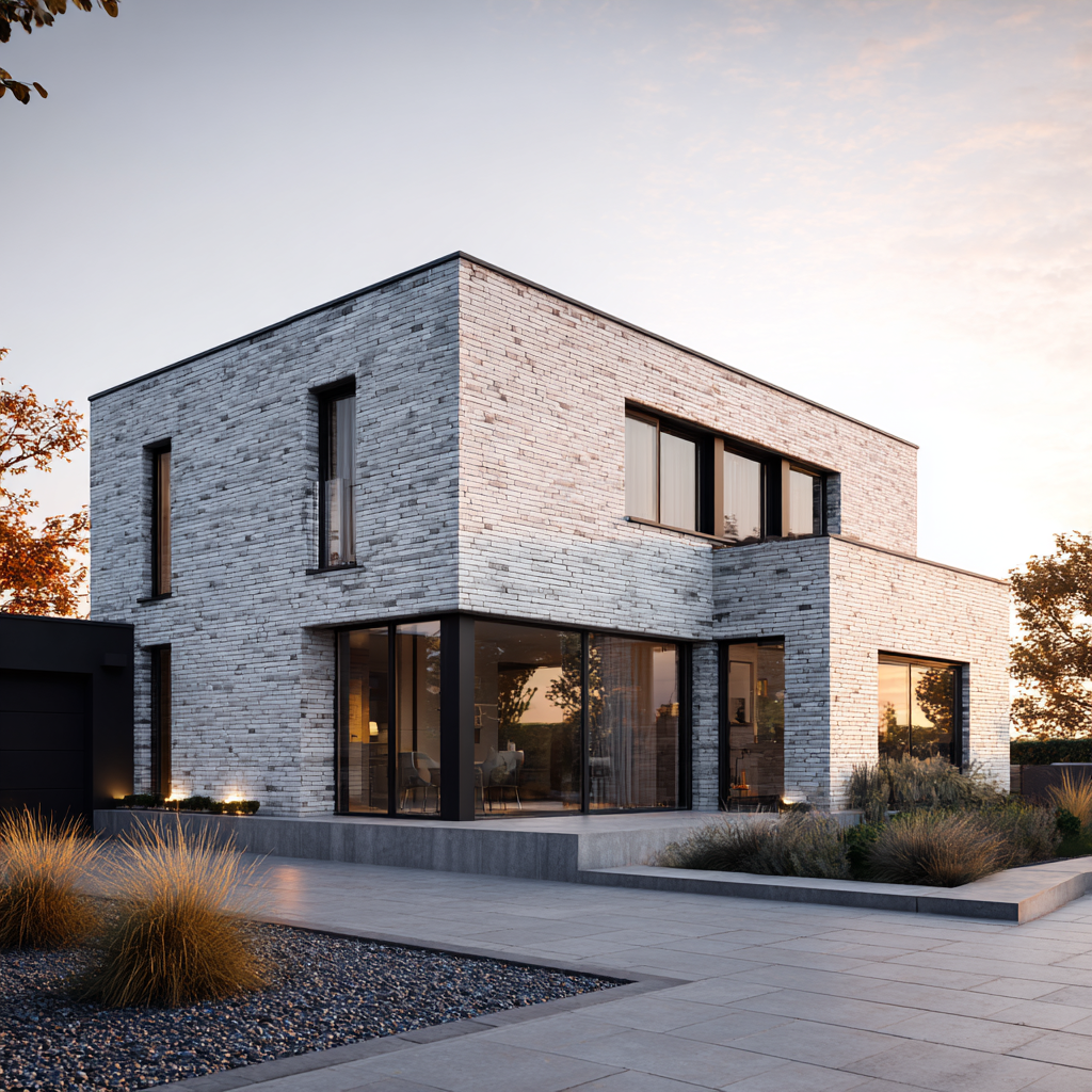 Der Küstenquader 145 steht für moderne, norddeutsche Architektur in ihrer klarsten Form. Der hellgraue Klinker verleiht dem Gebäude eine elegante Leichtigkeit, während der kubische Baukörper und das flache Dach für eine zeitgemäße, puristische Anmutung sorgen. Die großzügigen, bodentiefen Fensterfronten öffnen das Haus weit zur Umgebung hin und schaffen ein helles, weites Raumgefühl.