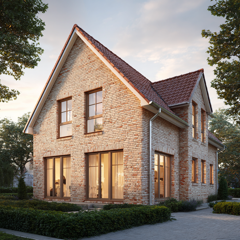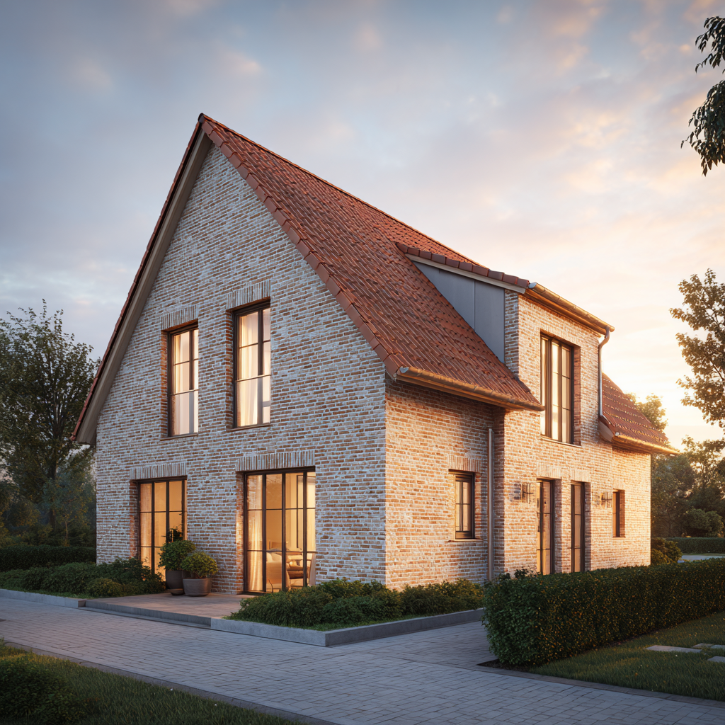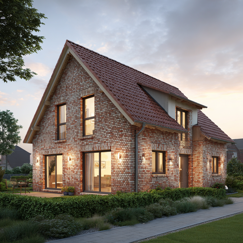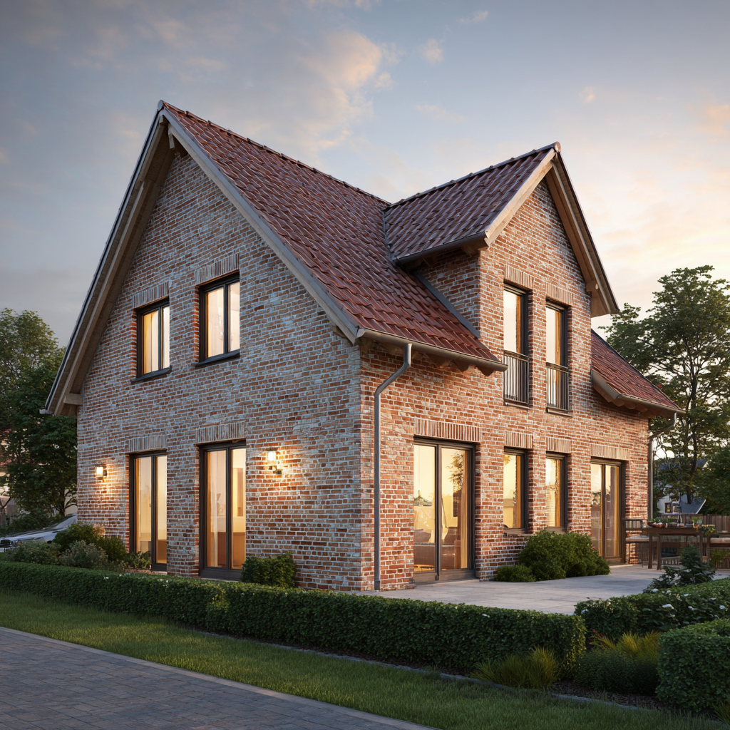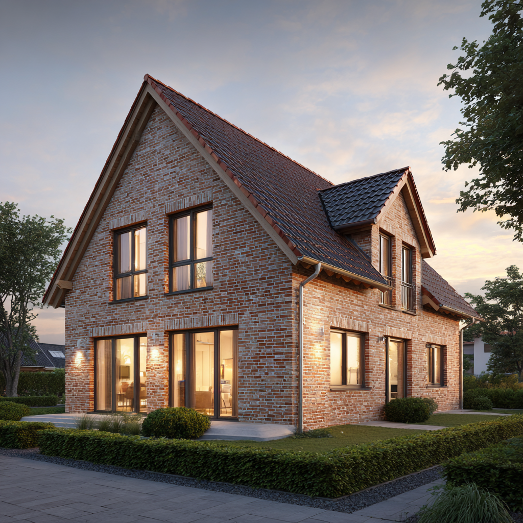 Wenn am Abend das Licht durch die bodentiefen Fenster fällt und der Sandklinker warm aufleuchtet, zeigt sich die besondere Atmosphäre dieses Hauses: ein Gefühl von Geborgenheit, Vertrauen und bleibender Qualität.