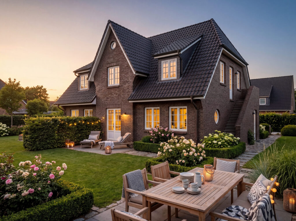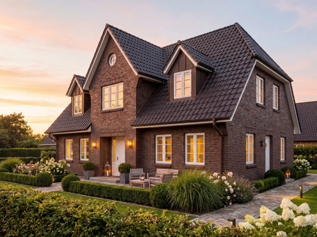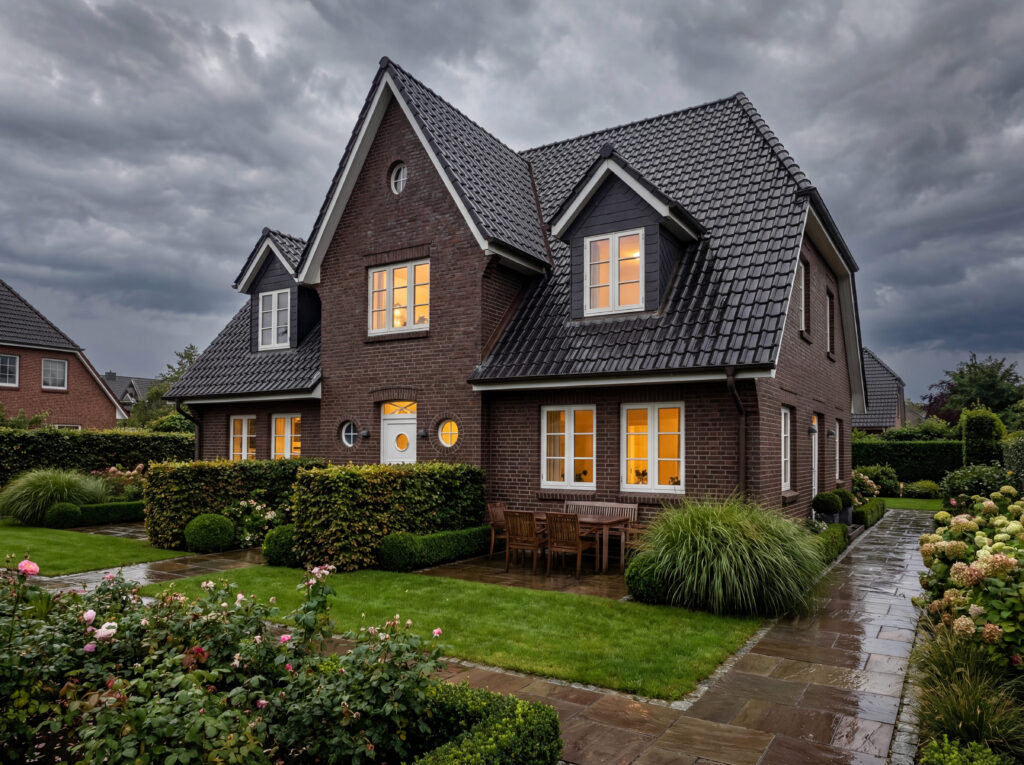 Ein prägendes Merkmal ist die hochwertige Klinkerfassade, die dem Haus seinen charakteristischen norddeutschen Ausdruck verleiht. Klinker gilt seit Jahrhunderten als typisches Baumaterial der Küstenregion: robust, langlebig und besonders widerstandsfähig gegenüber Wind und Wetter. Gerade in Küstengebieten hat sich dieser Baustoff bewährt. Die kräftige Farbgebung des Klinkers verleiht dem Haus Tiefe und Charakter, während die klassische Fassadengliederung für eine ruhige und wertige Ausstrahlung sorgt.