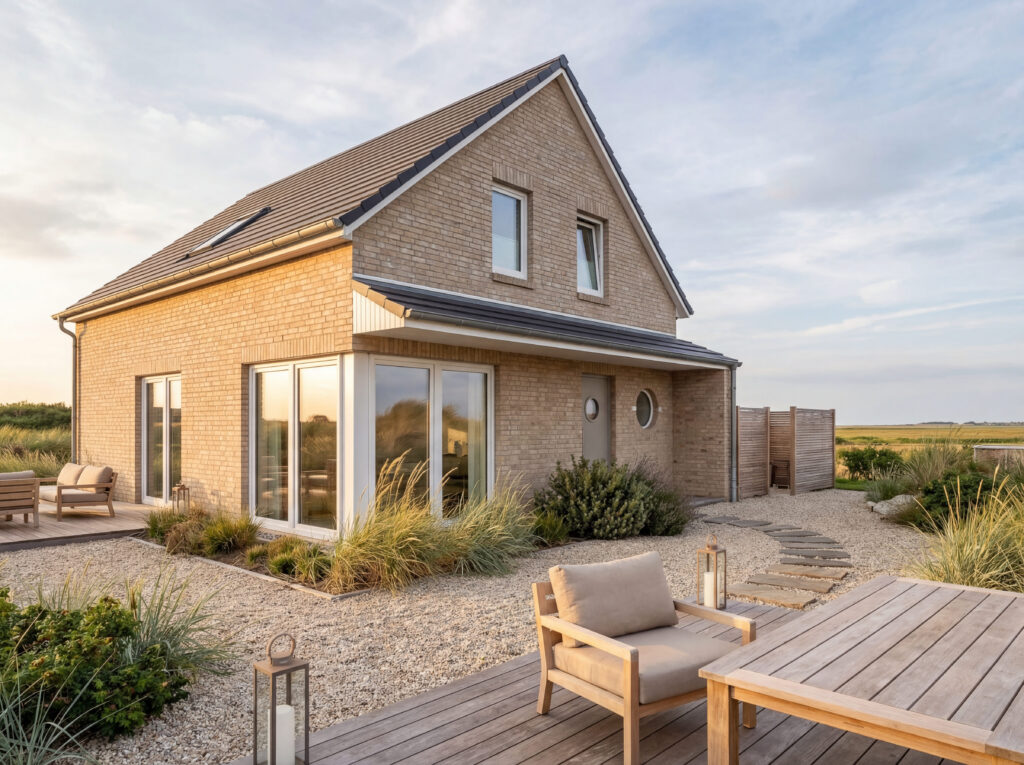 Besonders prägend ist die Fassade aus sandfarbenem Klinker. Dieses Material ist seit Jahrhunderten ein fester Bestandteil norddeutscher Architektur. Klinker steht für Langlebigkeit, Widerstandsfähigkeit und einen unverwechselbaren Charakter. Wind, Regen und salzhaltige Luft können diesem Baustoff kaum etwas anhaben – ideale Voraussetzungen für ein Haus im Küstenraum.